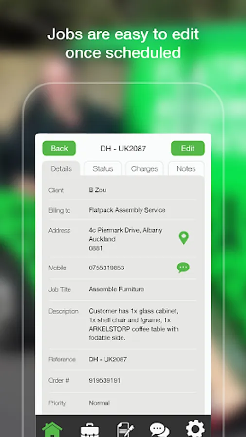 • Jobs are easy to edit once scheduled with the ability to change job status, add notes, charges and edit descriptions.