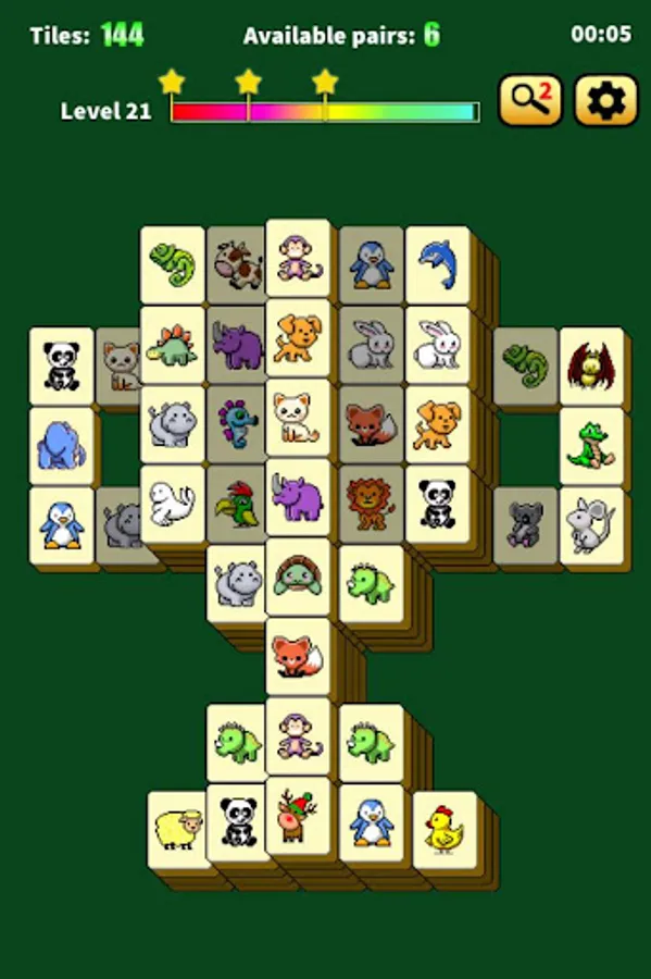 - You can only remove FREE animals that have a side on the left or right completely clear, and do not have another tile on top.