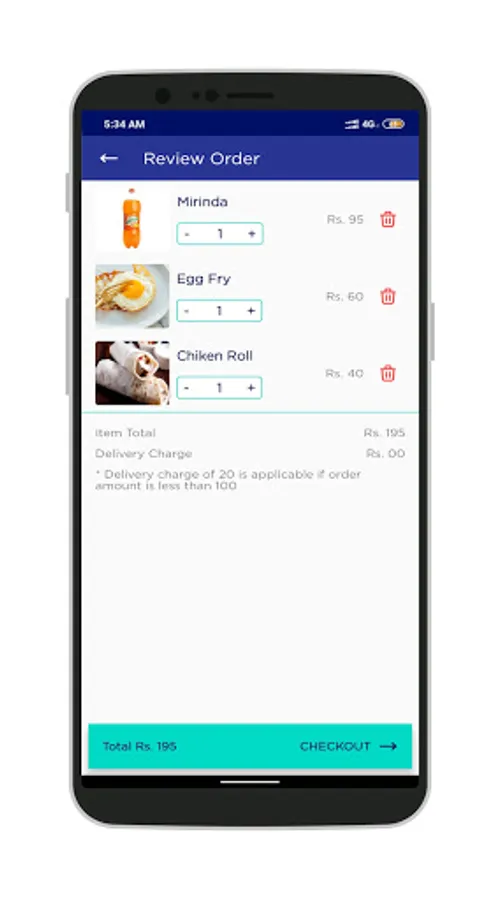 - Select any number of items from the menu listed with quality and price.