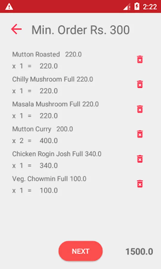 You can simply select different sizes of food like Full/Half and add item to cart by clicking add button. Click on cart button showing selected items with prices and total amount.