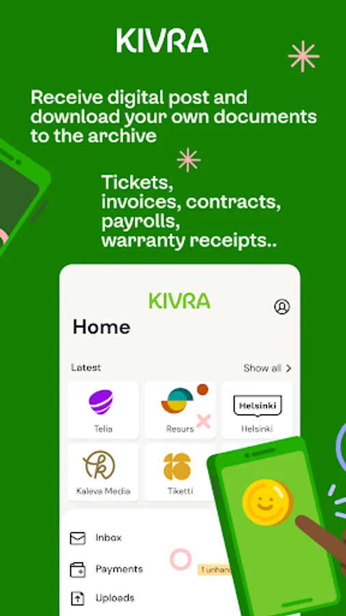 Kivra is a free of charge digital postal service, that gathers all your important documents in one secure and easy to use app. You can receive contracts, pay slips, event tickets, invoices and other digital mail to Kivra from over 40 000 companies and public organisations in Finland. On top of this, you can download your own documents to Kivra. Downloading and using Kivra is free of charge.