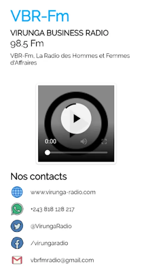 Generalist, Virunga Business Radio, (VBR-Fm), is a Commercial and Socio-Cultural Radio broadcasting in Goma, province of North Kivu, in the Democratic Republic of Congo (DRC) in the FM band on the 98.5Mhz.