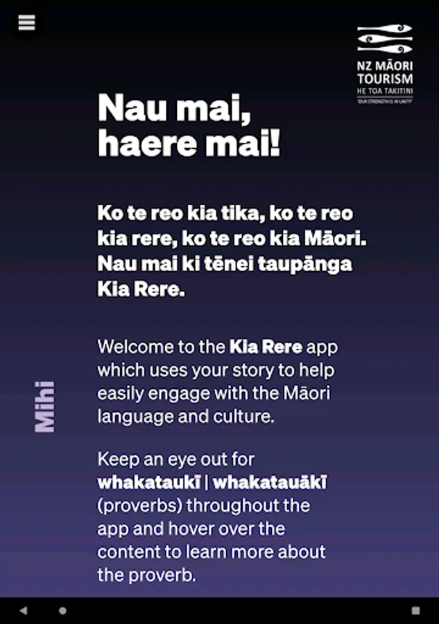 Welcome to the Kia Rere app which uses your story to help you easily engage with the Maori language and culture.