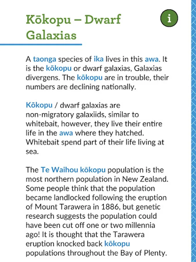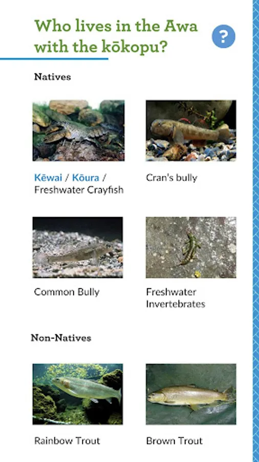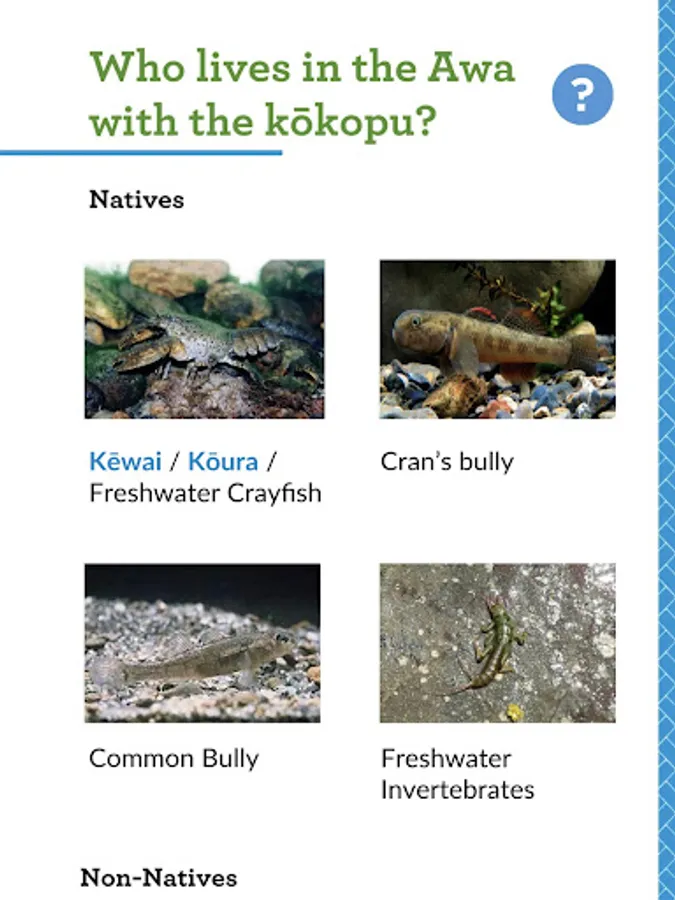 Kōkopu / dwarf galaxias are non-migratory galaxiids, similar to whitebait, however, they live their entire life in the awa where they hatched. Whitebait spend part of their life living at sea.