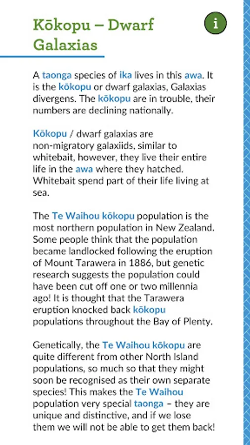 The Te Waihou kōkopu population is the most northern population in New Zealand. Some people think that the population became landlocked following the eruption of Mount Tarawera in 1886, but genetic research suggests the population could have been cut off one or two millennia ago! It is thought that the Tarawera eruption knocked back kōkopu populations throughout the Bay of Plenty.