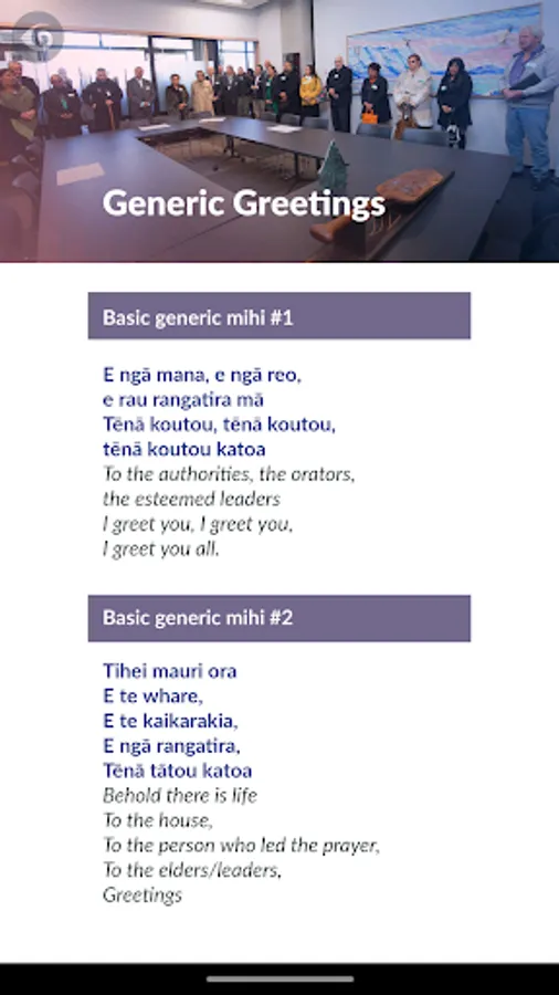 Interactive features within the app include pronunciation of Māori words, maps with Māori names and iwi groups, values (Ngā Mātāpono), and principles, mihimihi/pepeha (introductions), ngā mihi (greetings), poroporoaki (farewells), whakataukī (proverbs), and waiata (songs).