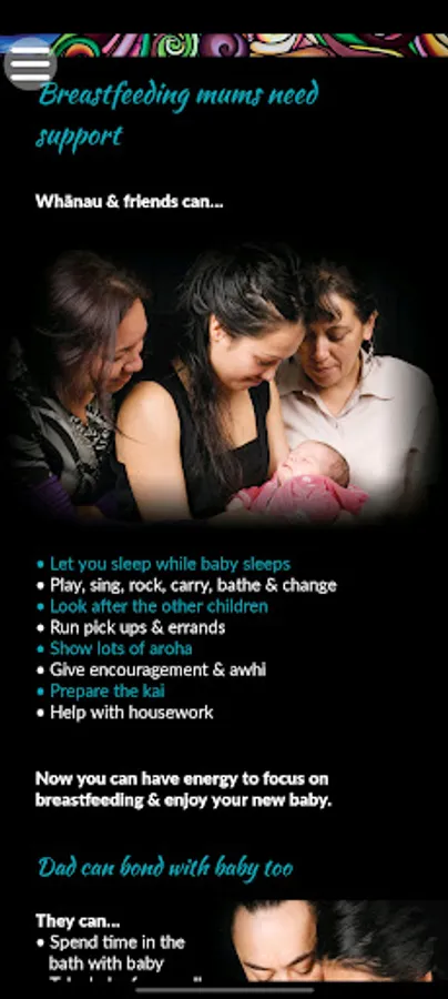 This application puts evidence-based information into a format that is user friendly and simple to understand. The information is appealing, instructive, innovative and motivating. The app is designed to be used by both mothers and families but also for Health professionals working with breastfeeding mothers to use as a visual tool. The content within this application has been approved by the New Zealand Ministry of Health and endorsed by NZBA and Hāpai Te Hauora.