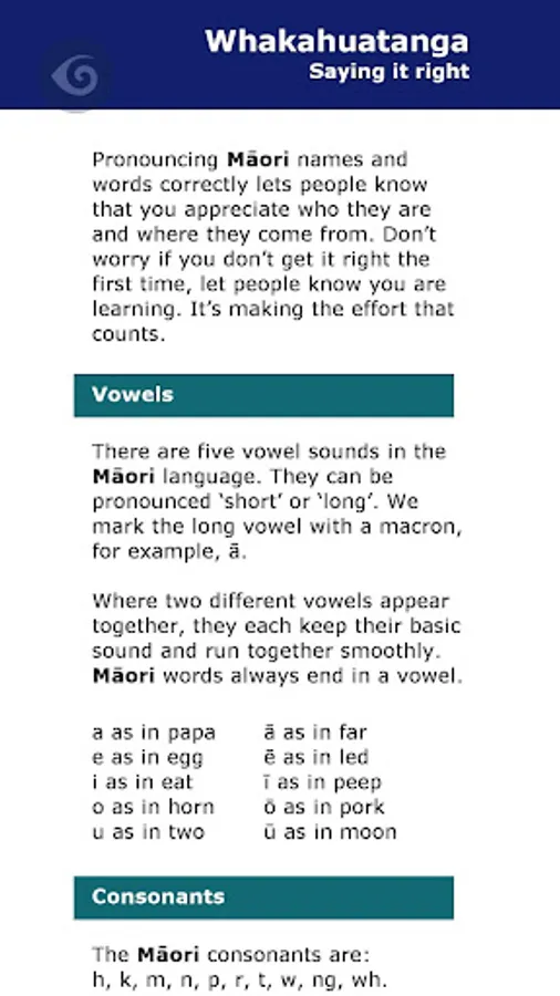Interactive features within the app include pronunciation of Māori words, maps with Māori names and iwi groups, mihimihi/pepeha (introductions), ngā mihi (greetings), poroporoaki (farewells), whakataukī (proverbs), and waiata (songs).