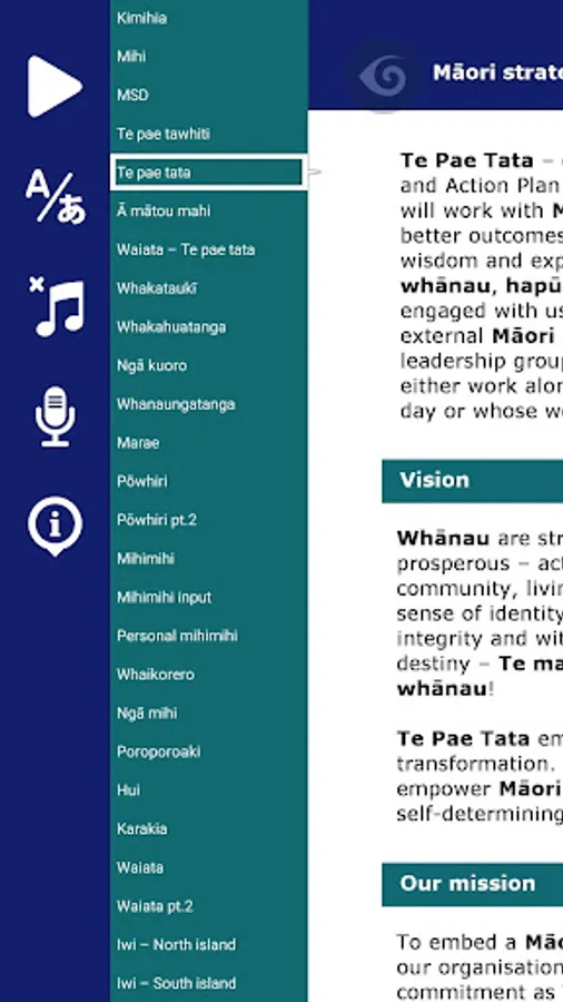 The app includes information on the Ministry’s Strategic Direction – Te Pae Tawhiti – Our Future, MSD’s Māori Strategy – Te Pae Tata, key Māori concepts and values, te reo Māori (language), tikanga (custom) and waiata (songs) to help staff understand more about our unique and shared cultural heritage and further express our MSD vision and purpose.