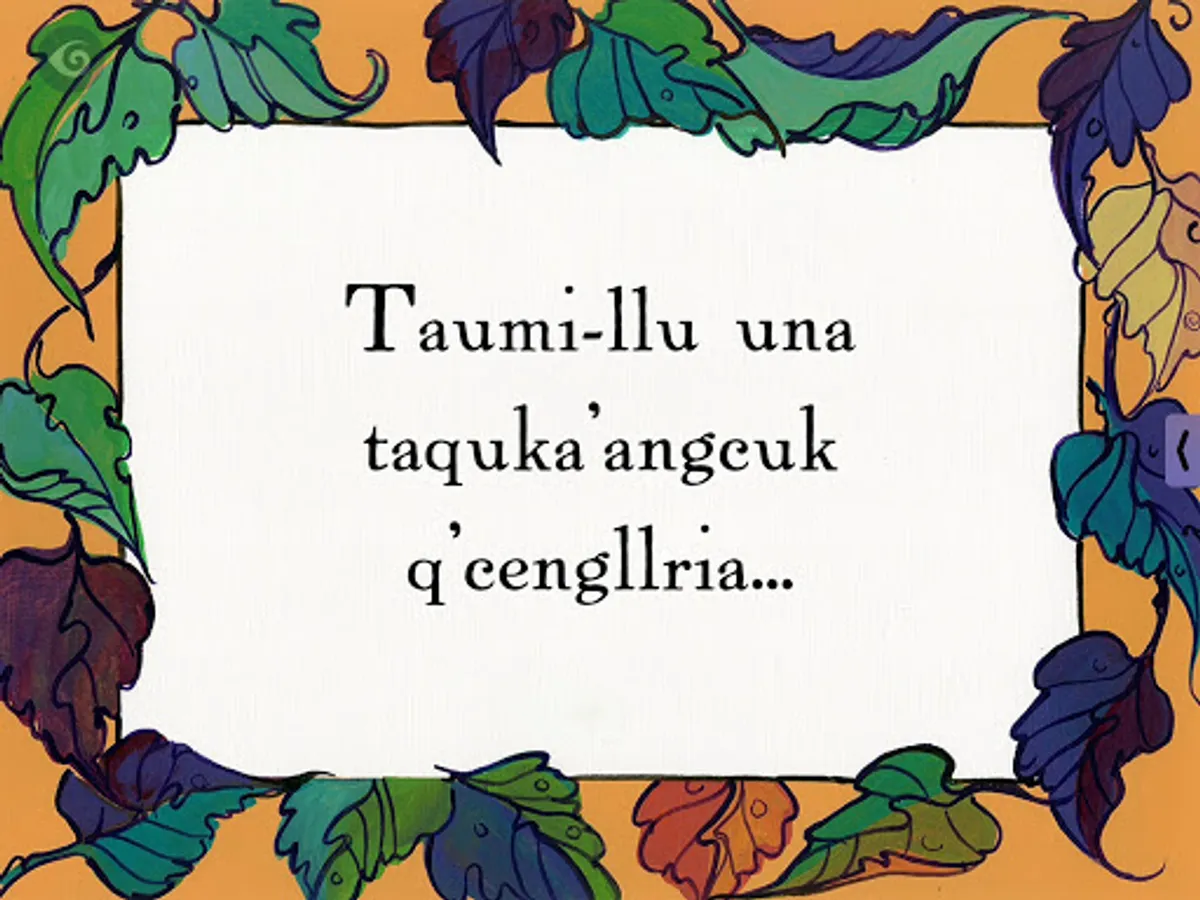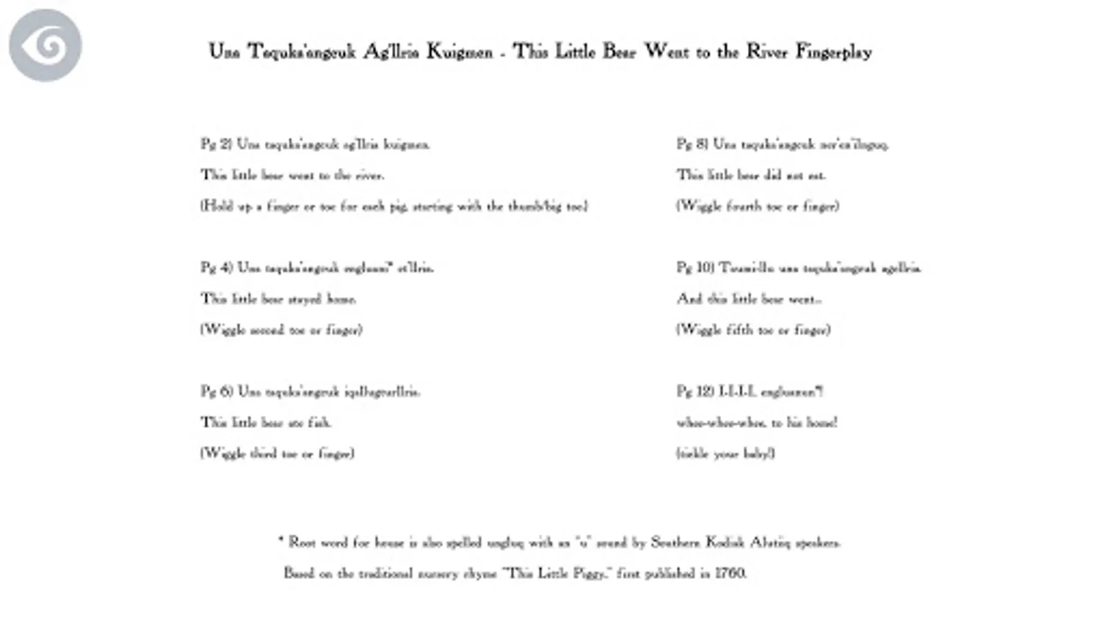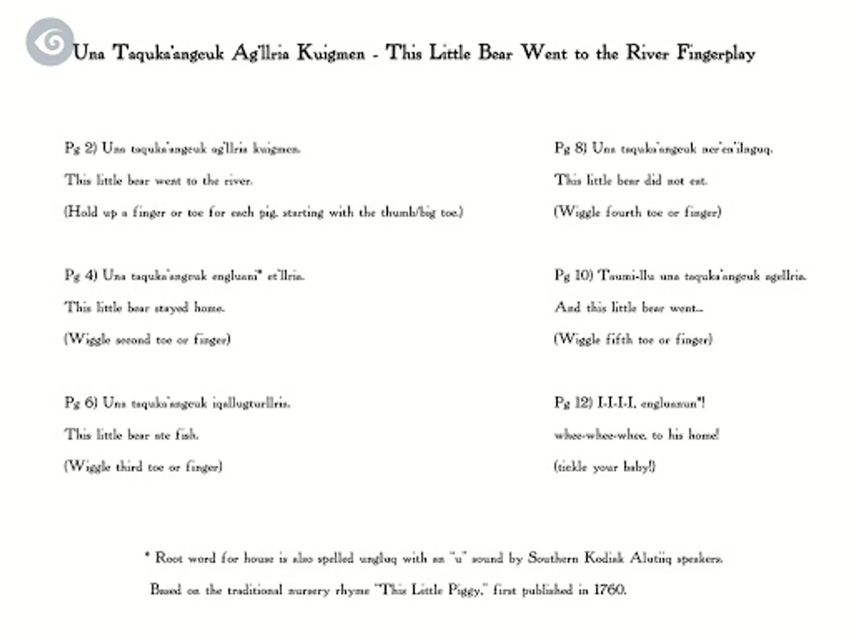 Una Taquka'angcuk Ag'llria Kuigmen is based on the traditional nursery rhyme "This Little Piggy" first published in 1760.