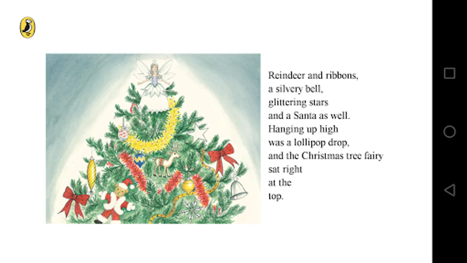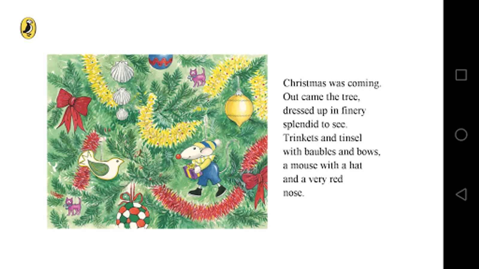 'Christmas was coming. Out came the tree, dressed up in finery, splendid to see. Trinkets and tinsel with baubles and bows, a mouse with a hat and a very red nose.'