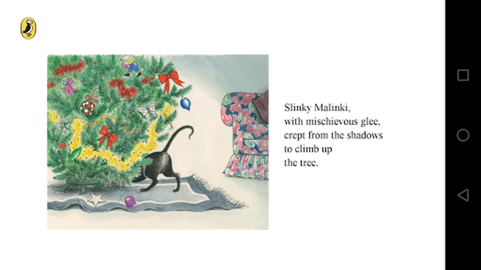 It's Christmas in Slinky Malinki's house and the rapscallion, mischievous cat is most curious about the Christmas tree. With its reindeer, ribbons, baubles and bells, it's too tempting a treat for Slinky not to investigate. So Slinky Malinki, with mischievous glee, creeps out from the shadows to climb up the tree . . .
