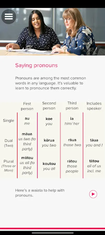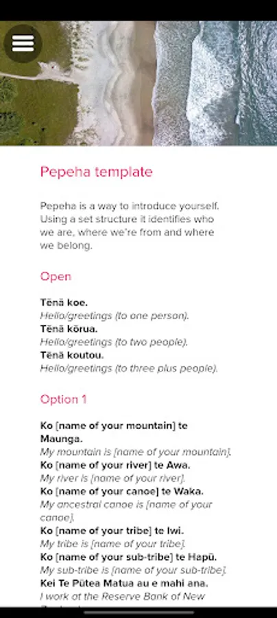 The app includes information on Te Reo Māori (the Māori language), Tikanga (customs), mātāpono me ngā ūaratanga (principles and values), karakia (prayers/ affirmation) and waiata (songs).
