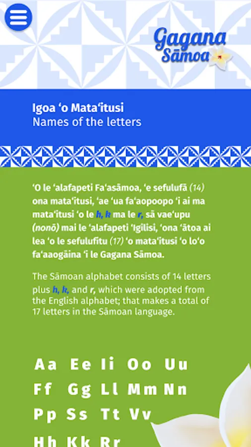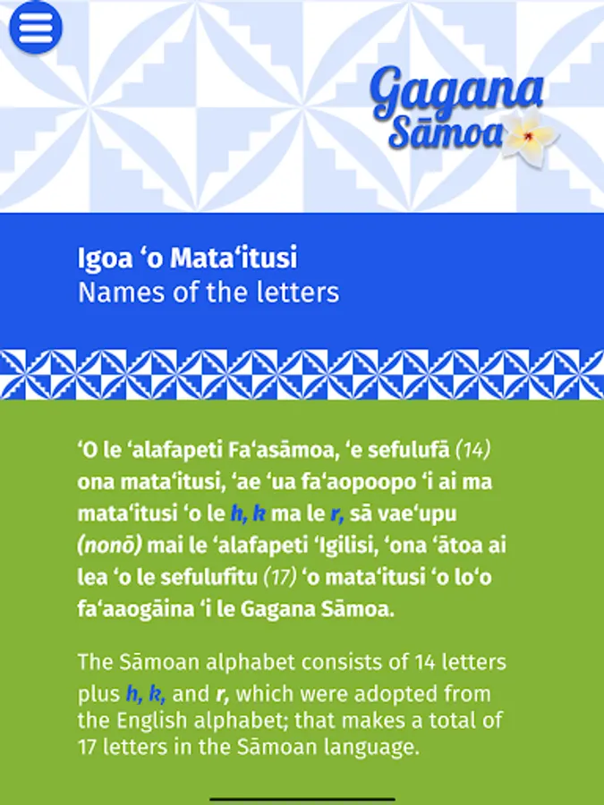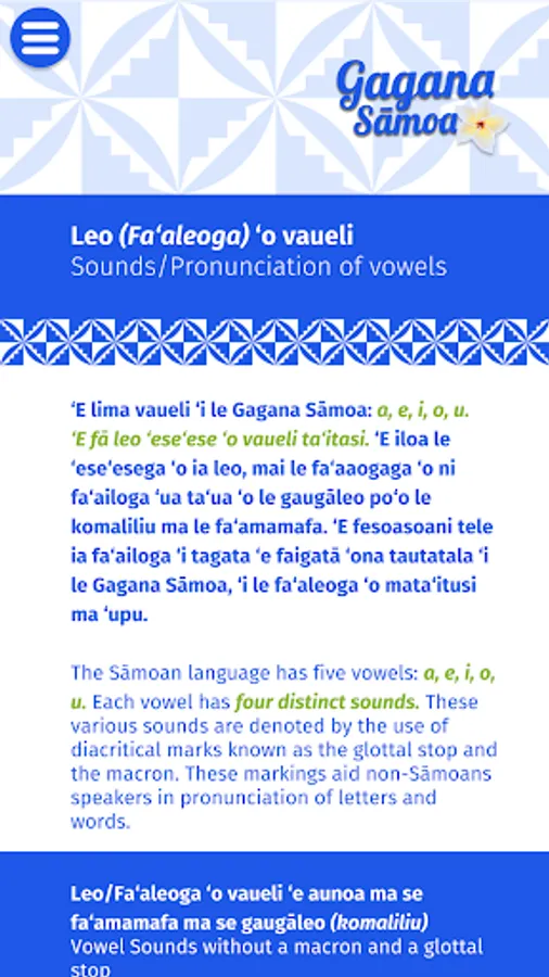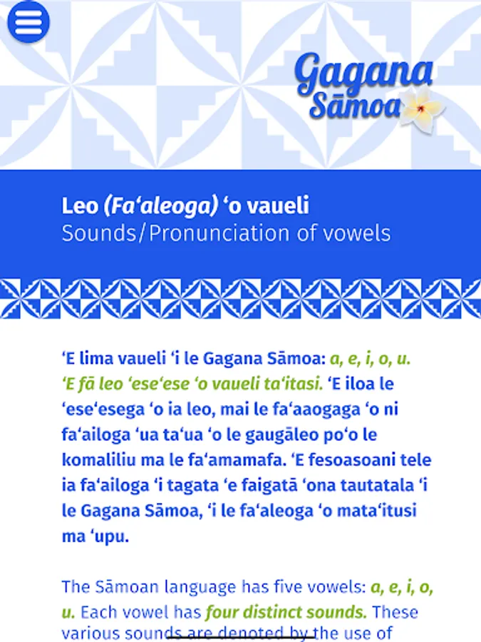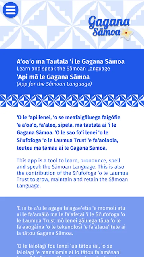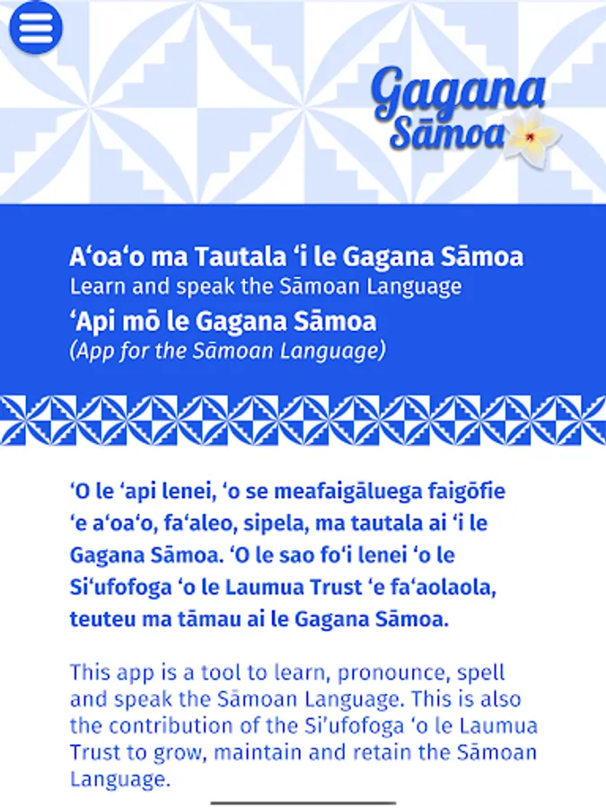 This app is a tool to learn, pronounce, spell and speak the Sāmoan Language. This is also the contribution of the Si’ufofoga ‘o le Laumua Trust to grow, maintain and retain the Sāmoan Language. Producing this app is a great innovative way for people to learn & speak the Samoan language. When swiping your finger across a letter, word, or sentence in the Samoan language on this app, you can hear how to say and pronounce the same. We have used the original spelling of the Samoan words with Glottal stop and macron as found in the early publications of the Samoan Bible. This will greatly assist second language learners with the pronunciation of vowels and words.