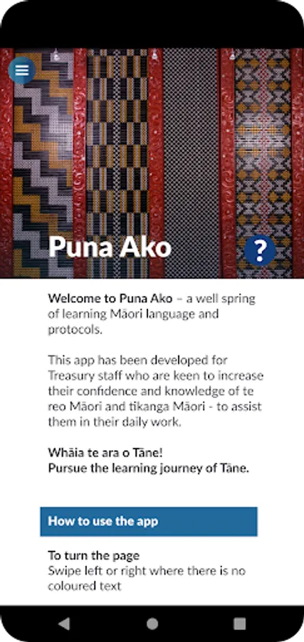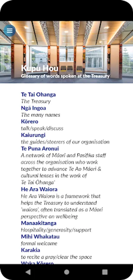 This app has been developed for Treasury staff and clients who are keen to increase their confidence and knowledge of te reo Māori and tikanga Māori to assist them in their daily work.
