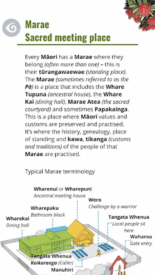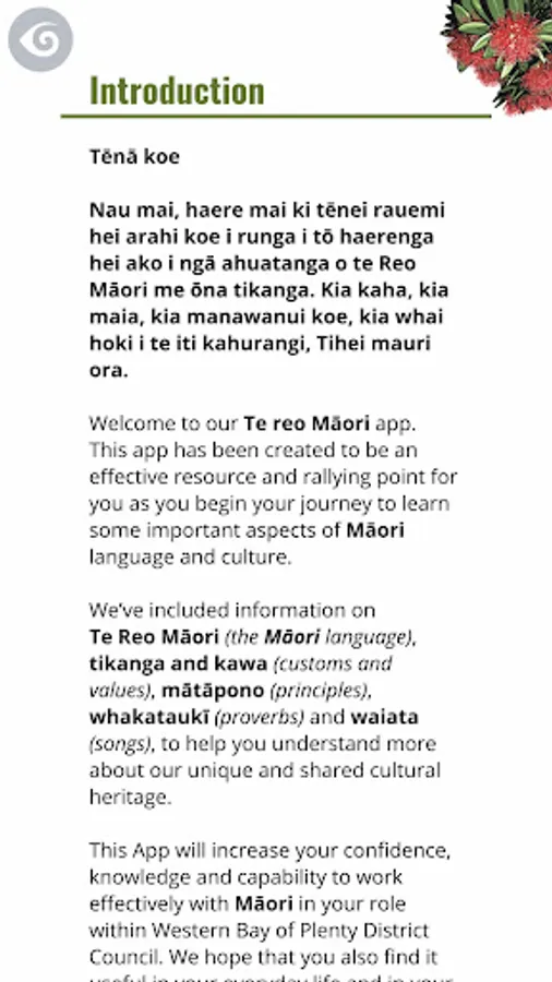 Interactive features within the app include pronunciation of Māori words, maps with Māori names and iwi groups, values (Ngā Mātāpono), and principles, mihimihi/pepeha (introductions), ngā mihi (greetings), poroporoaki (farewells), whakataukī (proverbs), and waiata (songs).