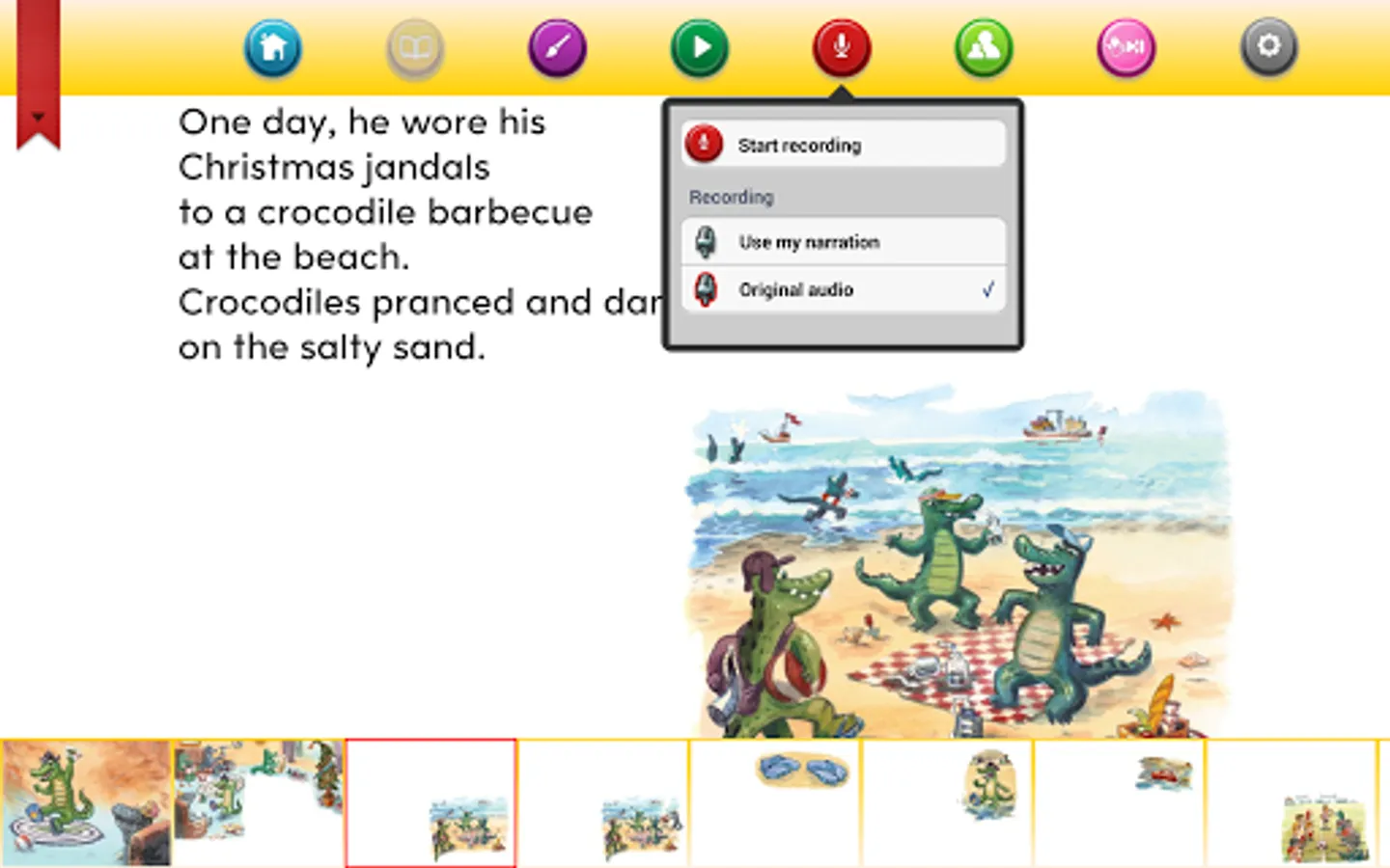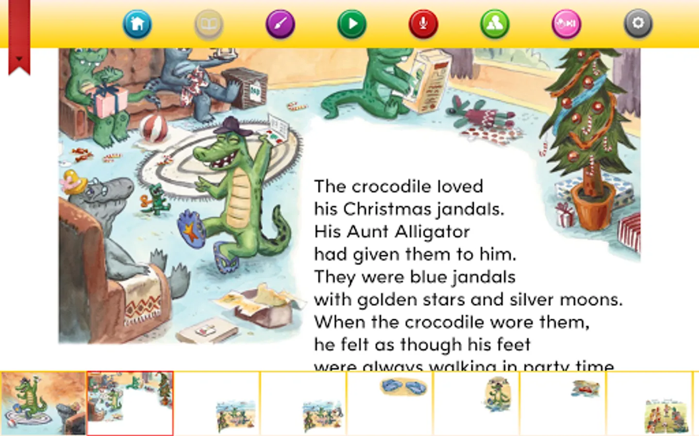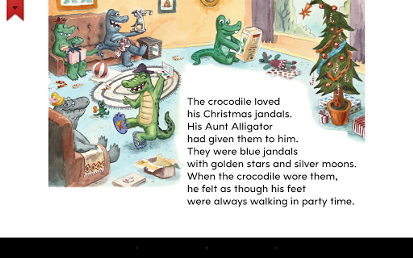 The crocodile loves his new Christmas jandals. But while he is at a beach barbecue, the waves steal away one of his blue jandals and all he can find is a left-foot red jandal. Later in the week, the crocodile wears the odd jandals to a football match. He discovers that he is sitting next to a girl who is wearing his jandal! They are both delighted to have found their missing jandals, and as well as finding his missing jandal, the crocodile is very happy to have found a new friend.