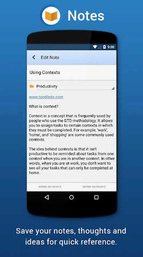 * Securely sync with Toodledo to backup your data and sync between devices.