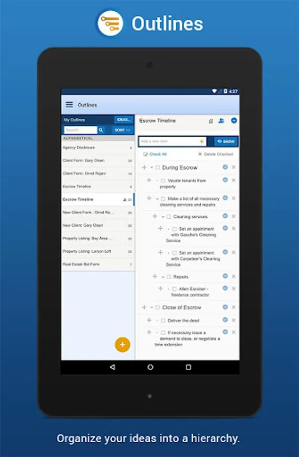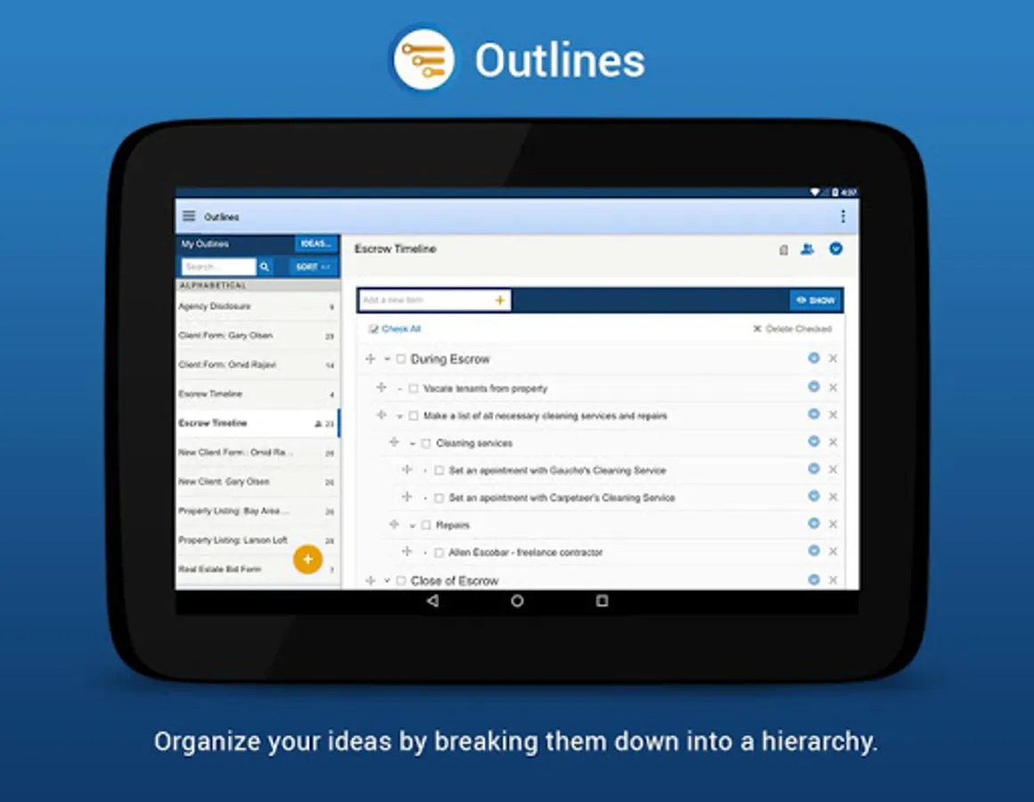 * Make hierarchical outlines to organize your ideas in our Outlines section (requires Android 4.2 or higher).