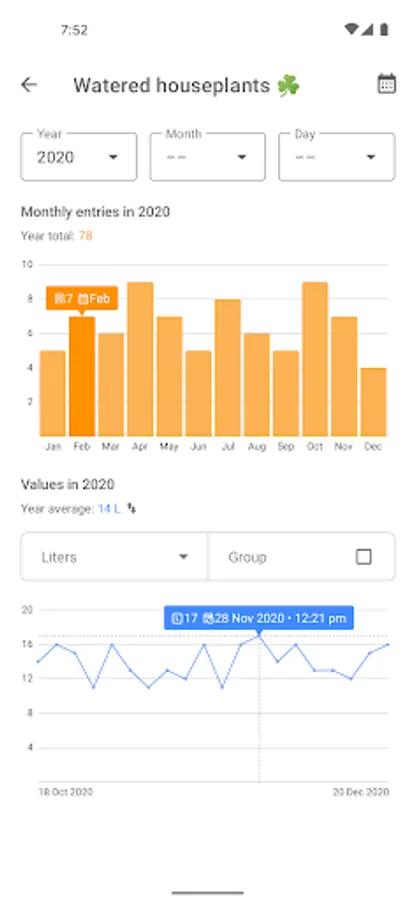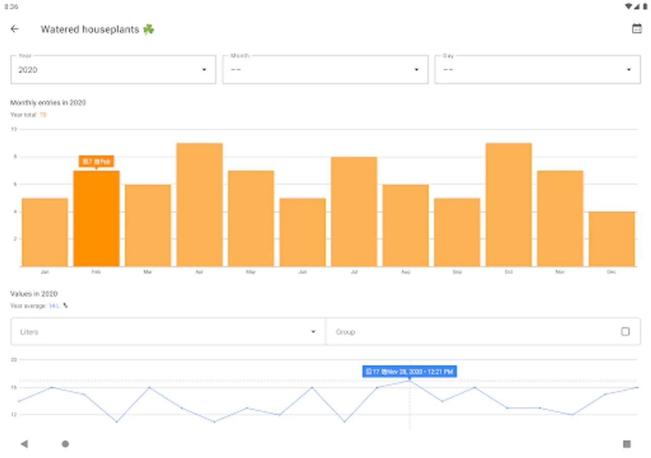 See how your entries change over time on a chart. Easily compare your entries by hour, day, month or year.