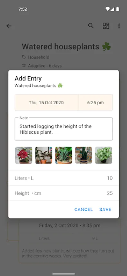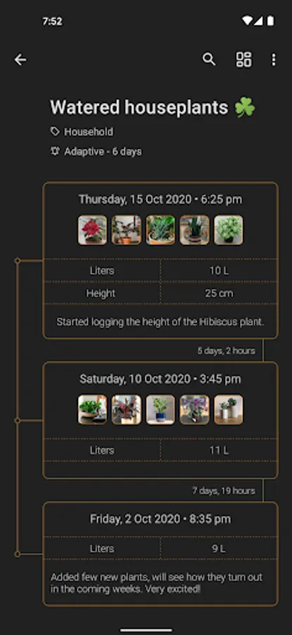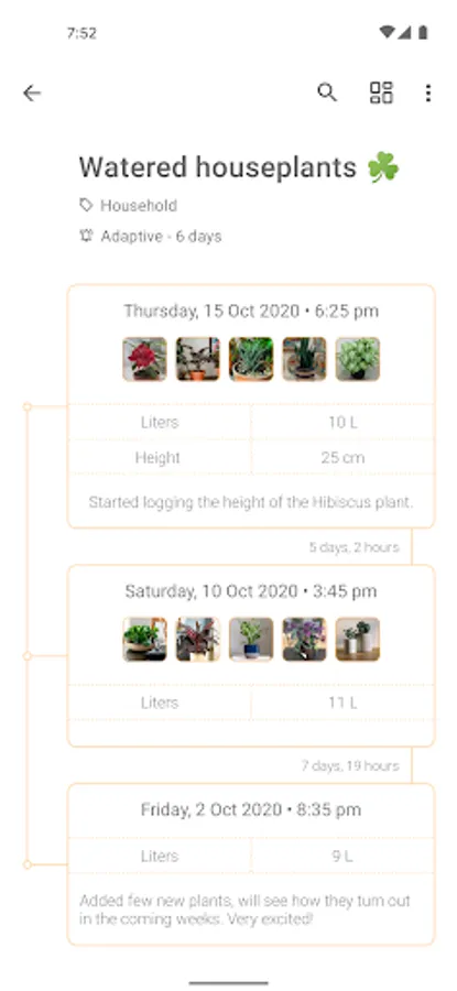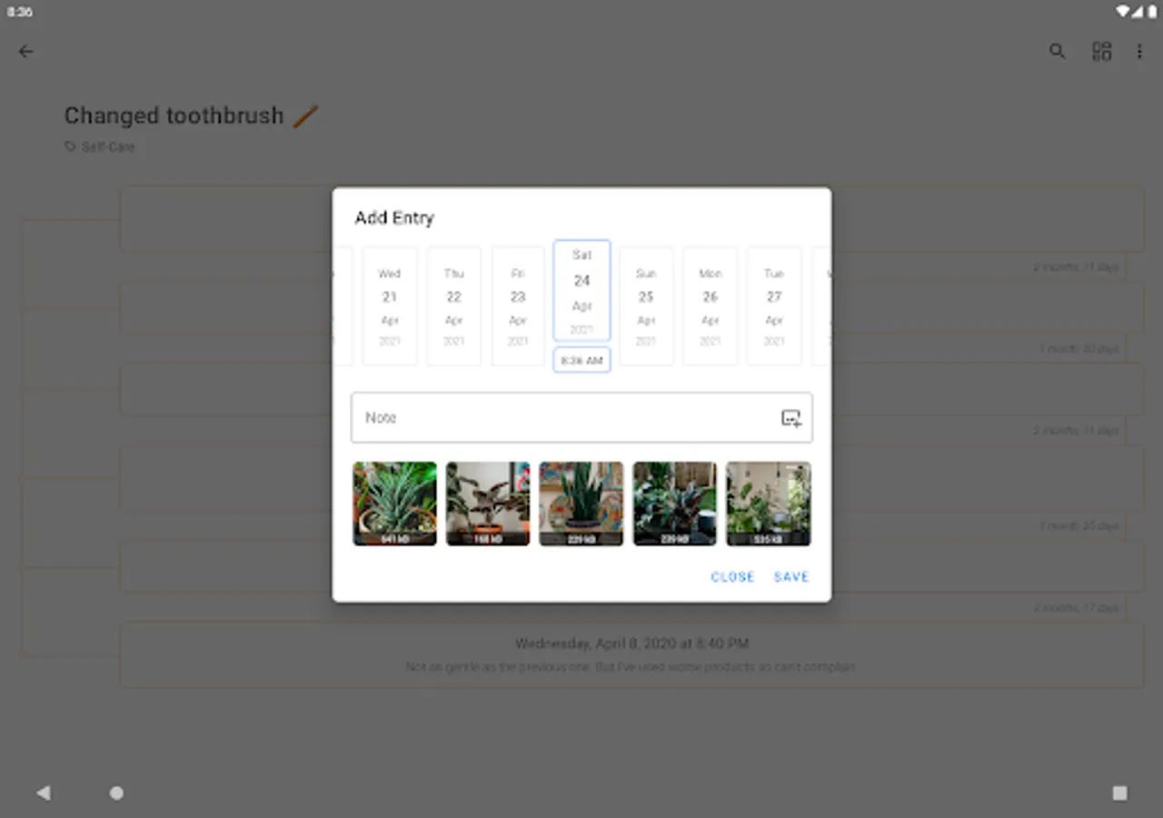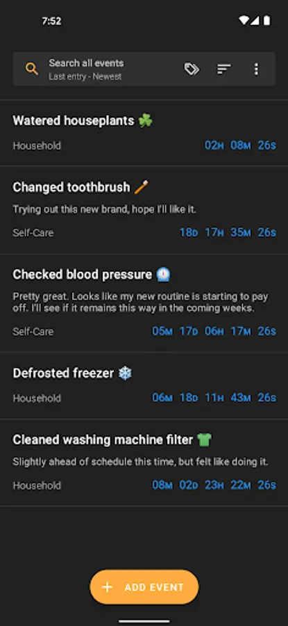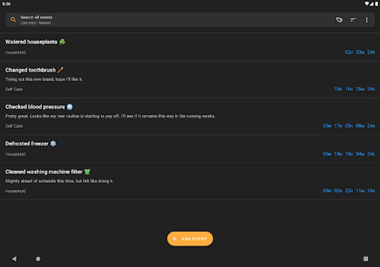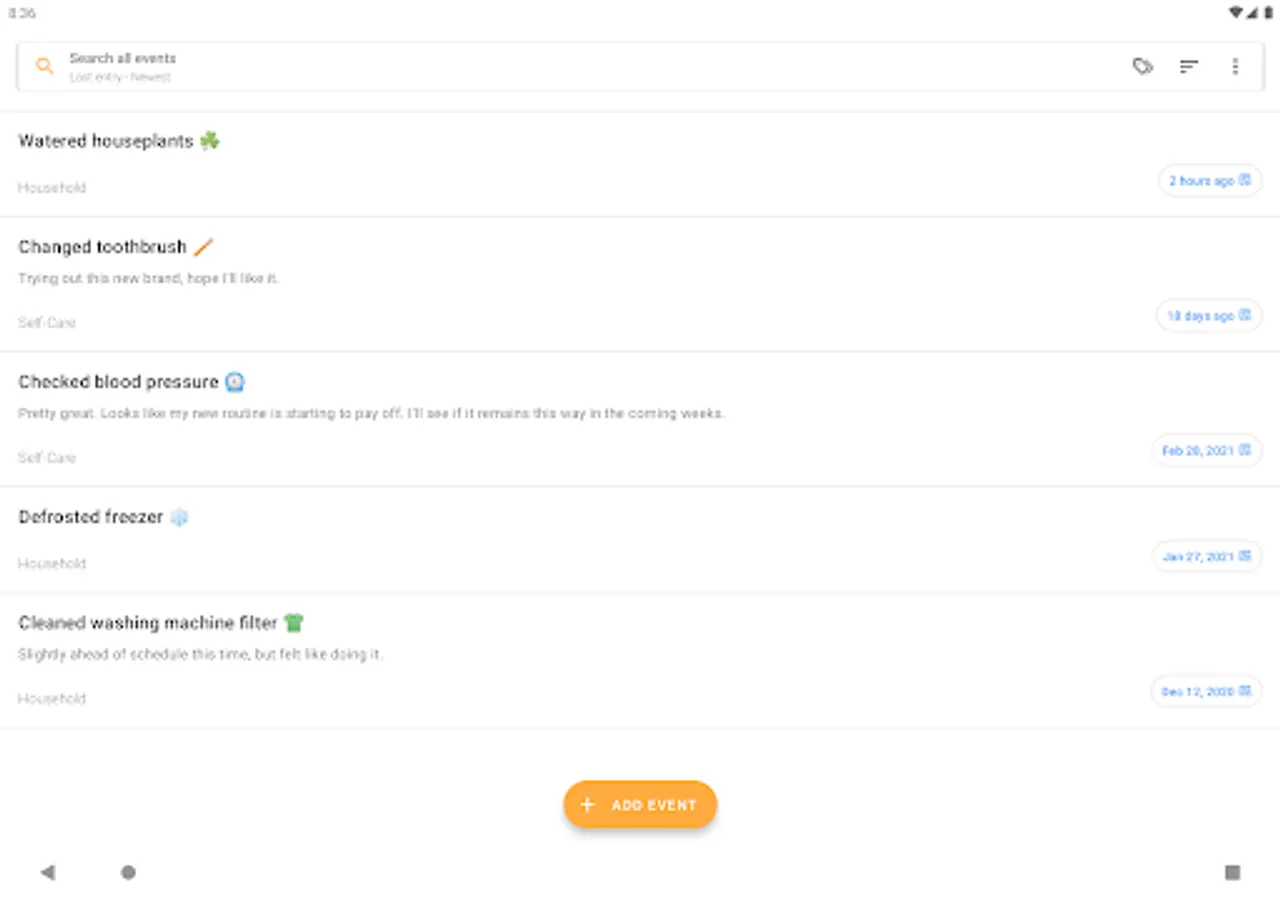 Add notes and photos in each event entry. See the time between entries and since the creation of each entry. Search entries by date-range or notes.