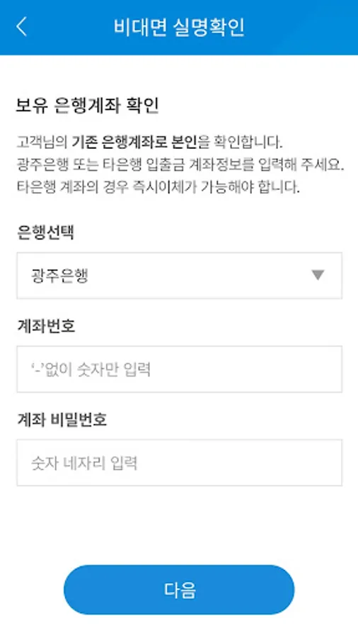 It is an application for non-face-to-face identity authentication that can be easily used with a smartphone, such as checking your bank account, submitting a copy of ID, and making a video call, to use financial services such as non-face-to-face product subscription and electronic financial subscription with Gwangju Bank.