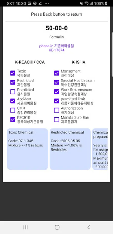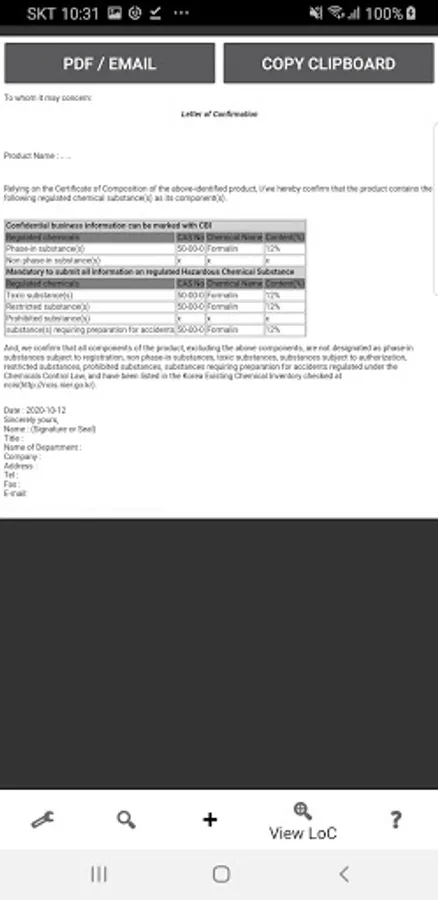 K-REACH LoC Creator is an application to check KECI database (Korea Existing Chemical Inventory) with CAS no. and to simulate creation of letter of confirmation(LoC) for Korea chemical regulatory requirement under Chemical Control Law and K-REACH. LoC is one of mandatory simple documents that oversea chemical producers must prepare for Korea importers for notification. Creators are recommended to check the website (https://ncis.nier.go.kr/) to check the latest update of inventory but this application can be used for chemical producers or sellers who are not familiar with Korean regulations: Chemical Control Act and K-REACH.