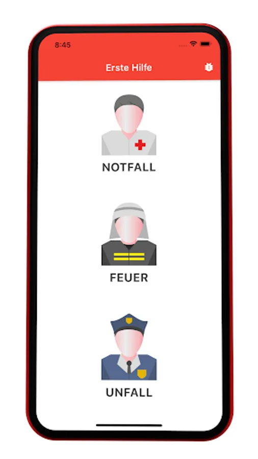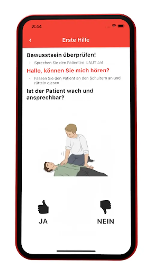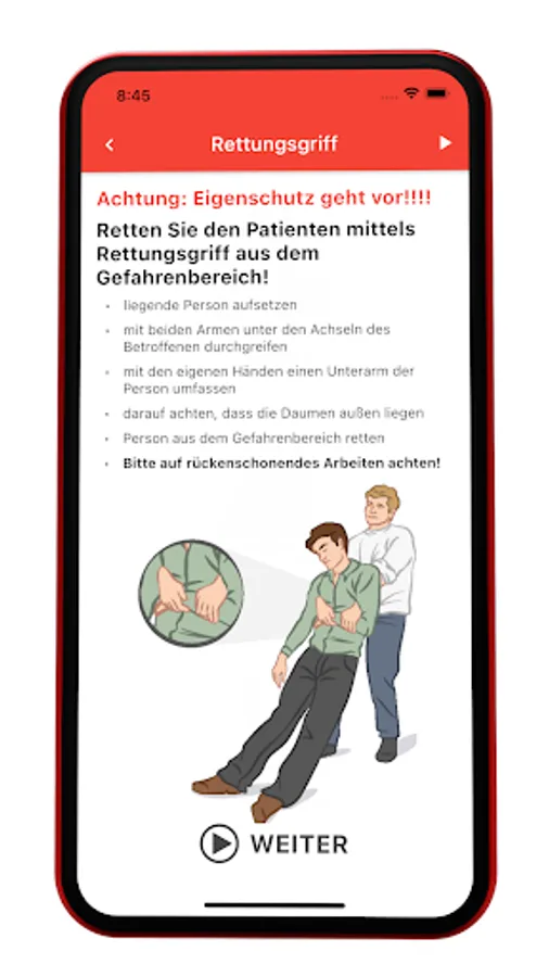 The first aid app of the Bildungsakademie - NRW supports every first aid worker (whether with or without a completed first aid course) in a real emergency situation. Whether there's a fire, a traffic accident or a medical emergency, the first aid app helps in every situation. Whether it is a traffic accident, house fire, resuscitation, stroke or heart attack, the user is guided through every emergency and / or supported in writing / acoustically / visually to provide assistance. An emergency call function including location information is integrated in the app so that first aid can be provided smoothly without interruption.