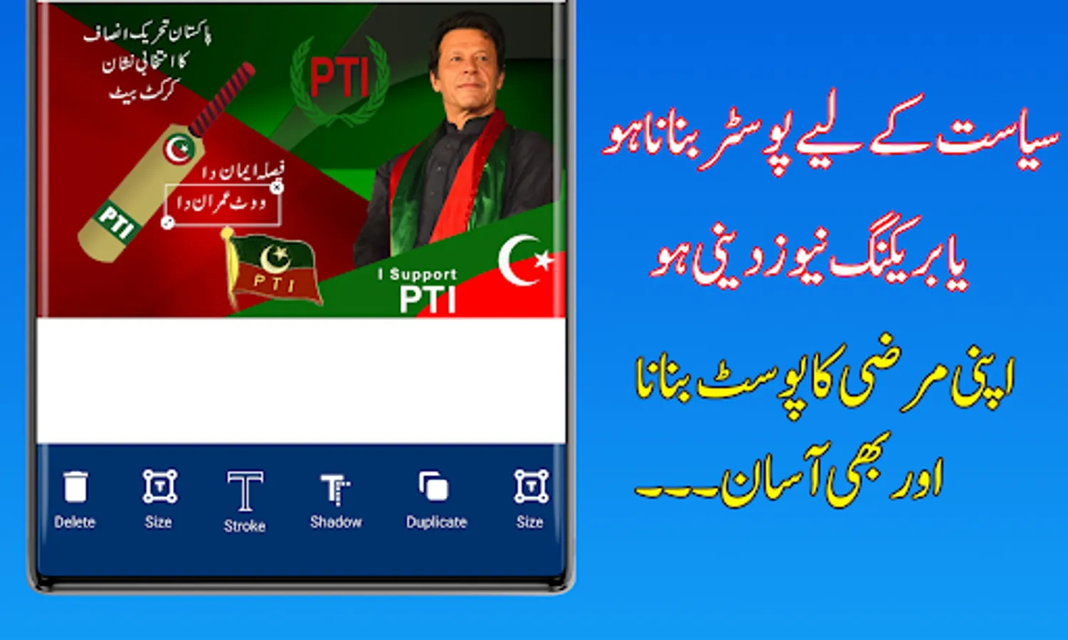 Urdu poster maker helps you to create advertisements for business, poetry/shairy writers, Islamic post designers, and banner flex maker. Create urdu post by panaflex maker in urdu fonts. Urdu writting app on photos of your favorite stylish fonts makes your panaflex easily. Urdu text on the photo have stickers and collection of hd backgrounds. Write Urdu Poetry from urdu status collection. PTI Banner Maker is a free graphic design app to create social media posts, presentations, and party posters.