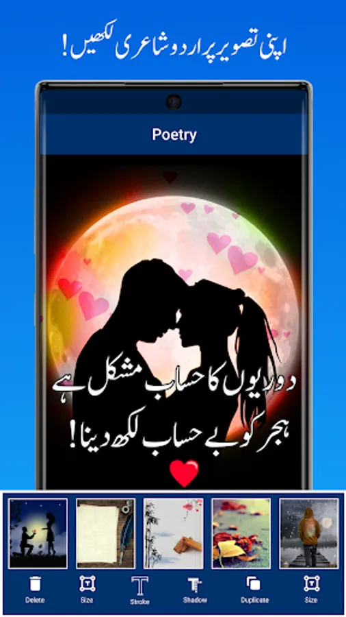 Design photo post maker app has features like photo editor and write urdu shayari on photo in beautiful style. Urdu Text on picture app helps you designing business banners. You can also write stylish urdu name on photos. You don't need any computer to design banner and social media posts, Urdu on Picture help users to create urdu flex in modern styles. you can write love letter on lovely romantic images to share your feelings with your love ones. Write Urdu on Photo app is perfect for you to create birthday wishes, anniversary, love messages & love status using urdu photo master.