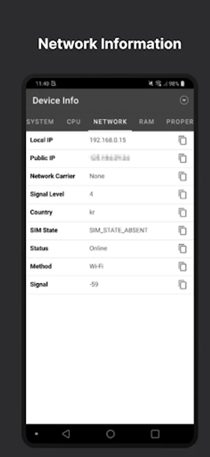 Local/Public IP, Carrier, Signal, SIM State, and so on.