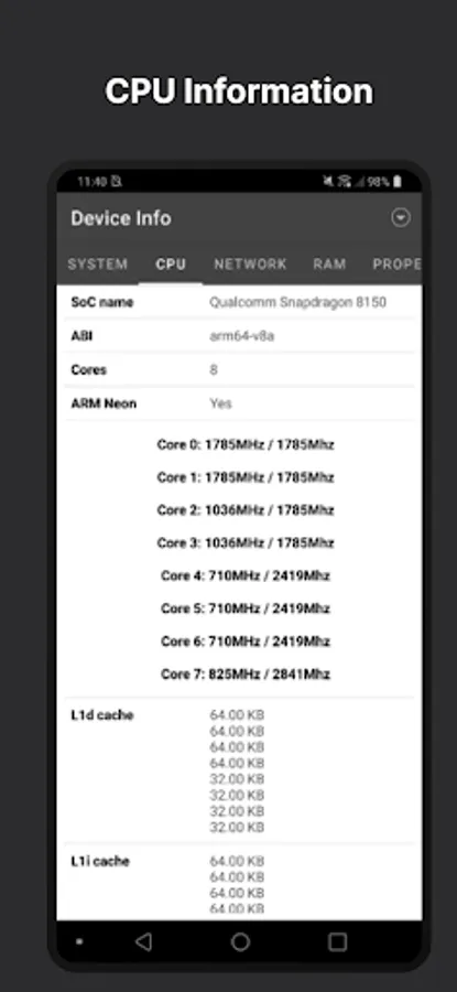 SoC Name, ABI info, Cores, Usage of Cores, caches.