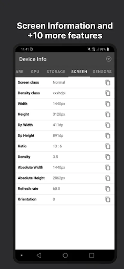 Screen Informations such as class, density, width, height, dp width/height, ratio, density, refresh rate.