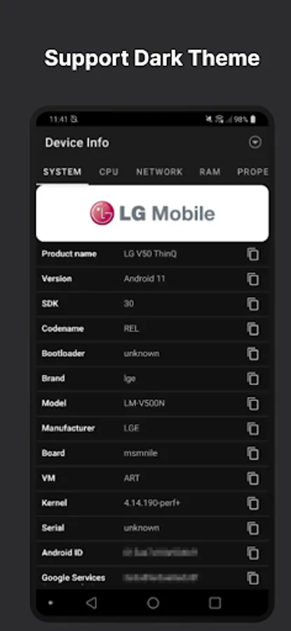Product Name, Android Version, SDK Version, CodeName, Brand, Model, Manufacture, Board, Kernel Version, and so on.