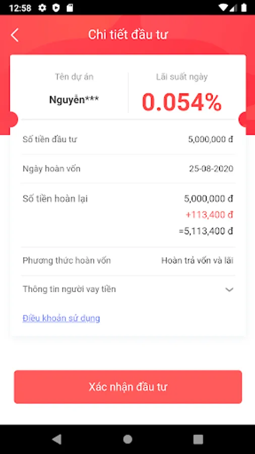 The investor will receive the principal and interest on time according to the previous loan request. The interest calculation period will be calculated on Day 1 from the date of successful transfer to customers.
