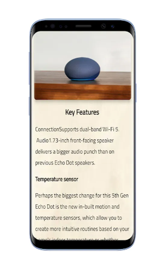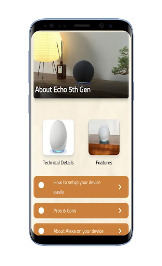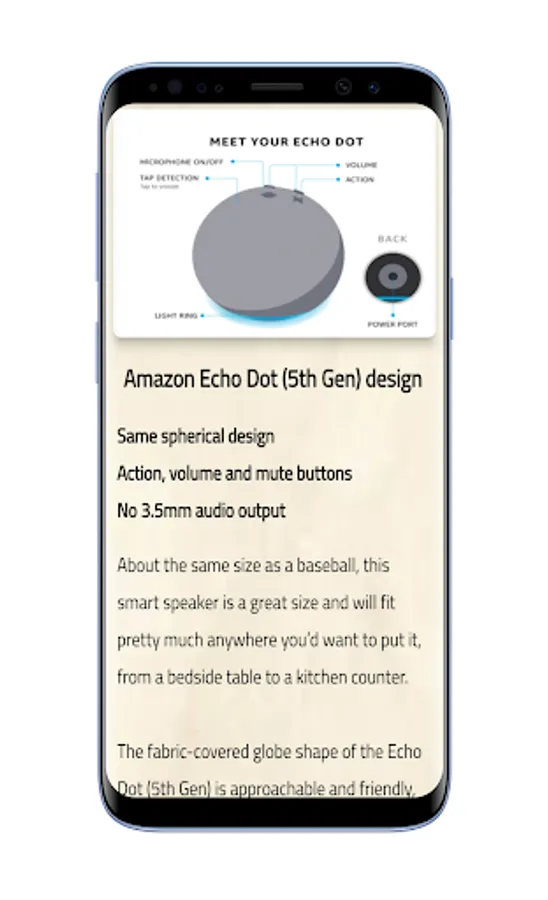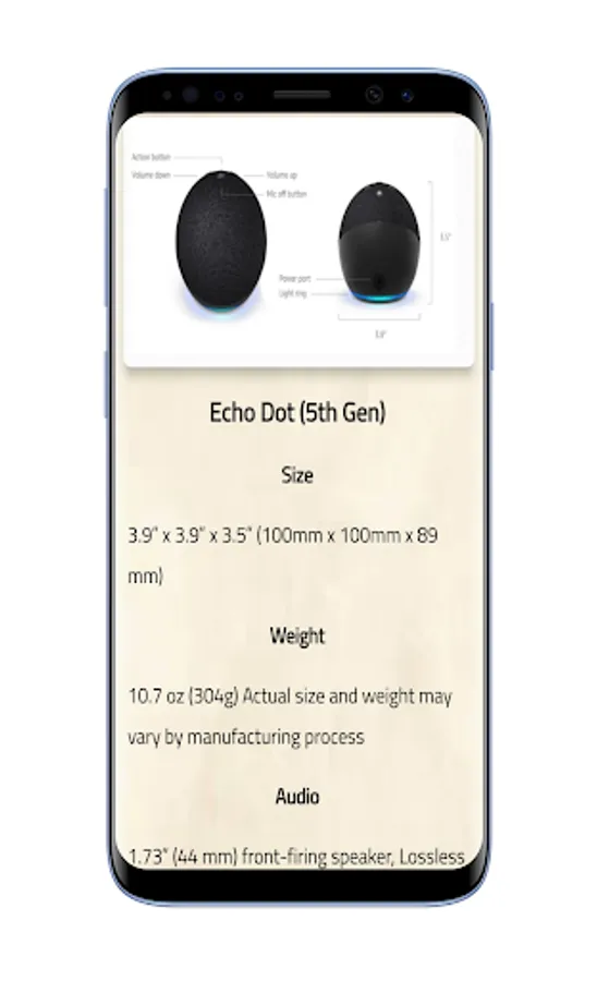 There are explanations such as Amazon Echo Dot 5th Gen features, how to setup your device, technical details be found on the app. The Amazon Echo Dot 5th generation have new temperature sensor, eero built-in wifi zone support, improved audio experience for clearer vocals, deeper bass, and vibrant sound.
