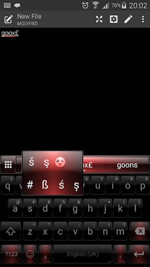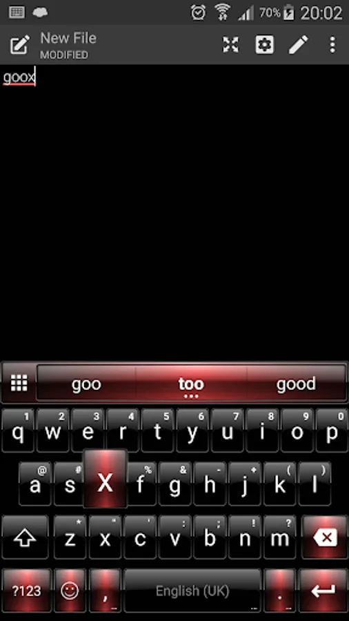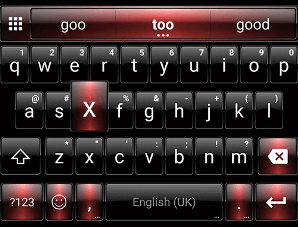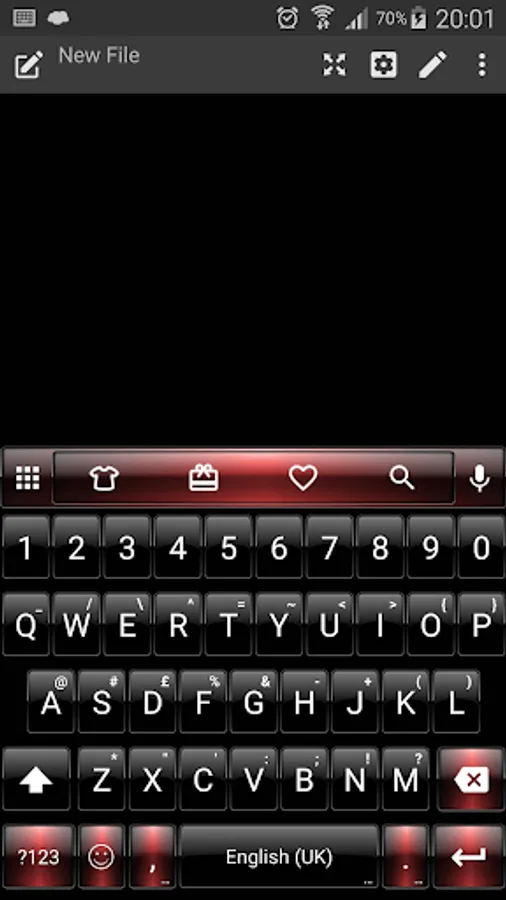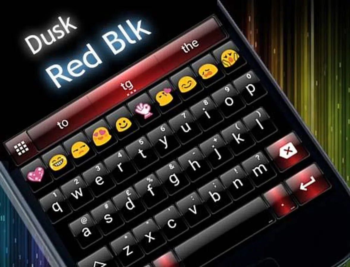 Dusk black red theme with black background and glowing red functions buttons along with glossy black normal buttons for Emoji Keyboard (Cute or Premium or KK version) application: please install Emoji Keyboard main program to use this theme.