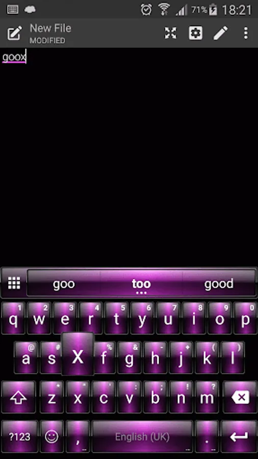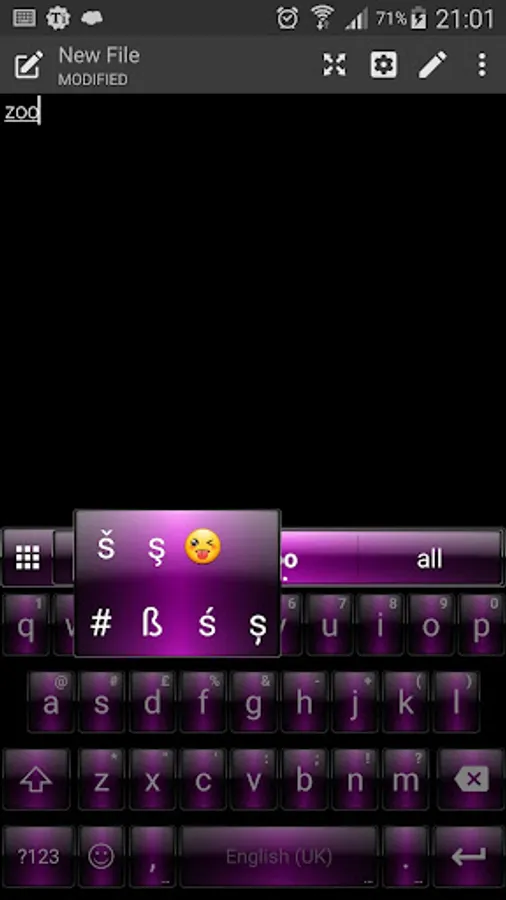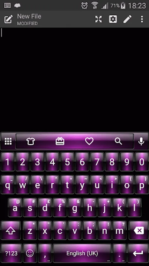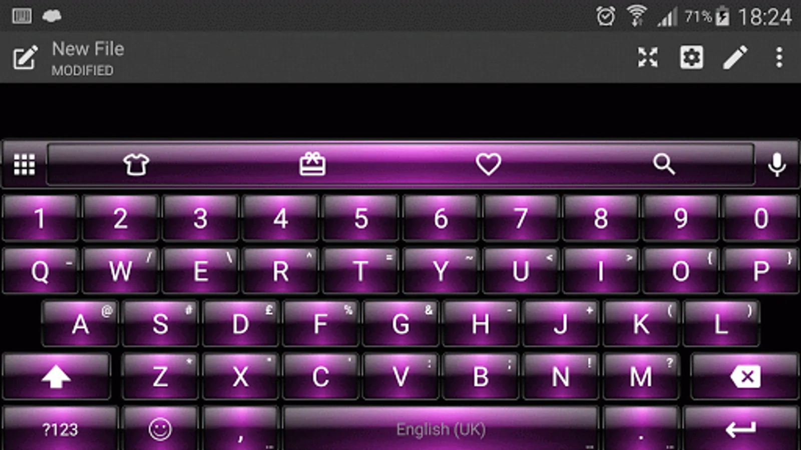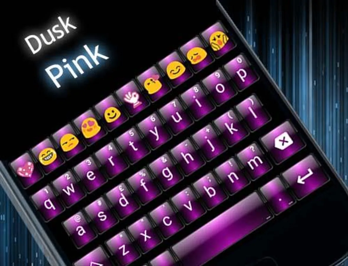 Dusk pink theme with black background and glowing purple buttons for Emoji Keyboard (Cute or Premium or KK version) application: please install Emoji Keyboard main program to use this theme.