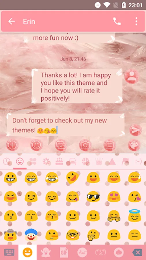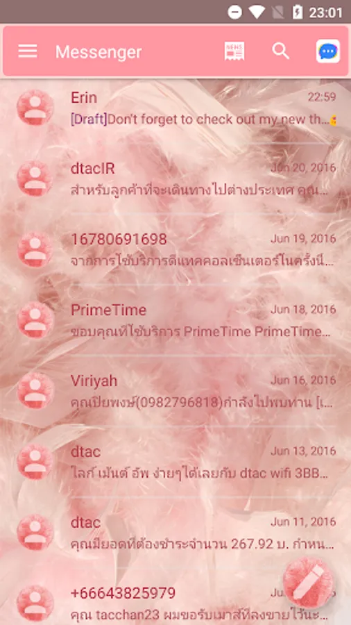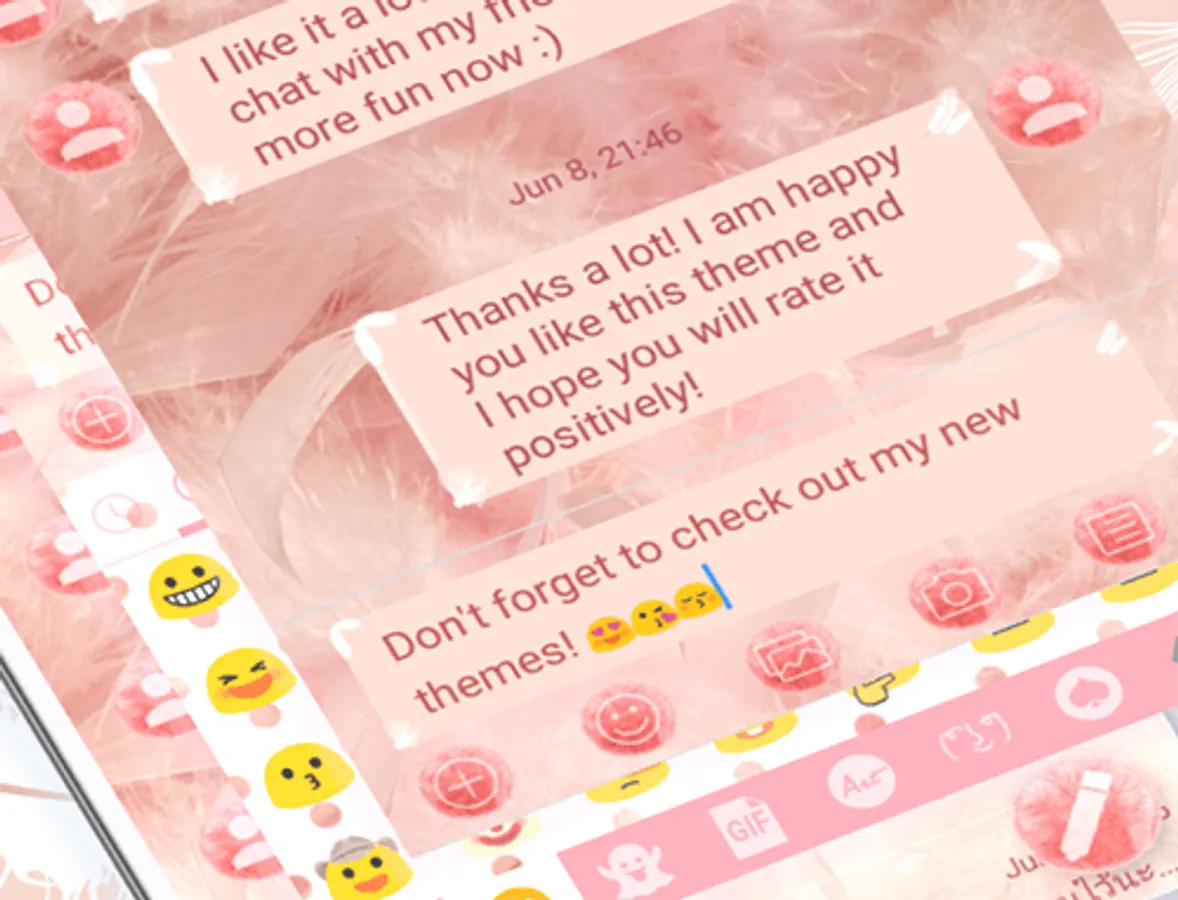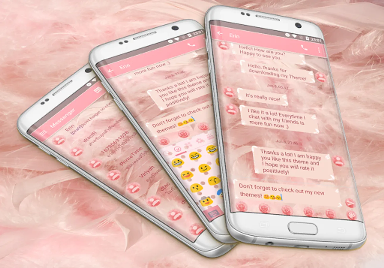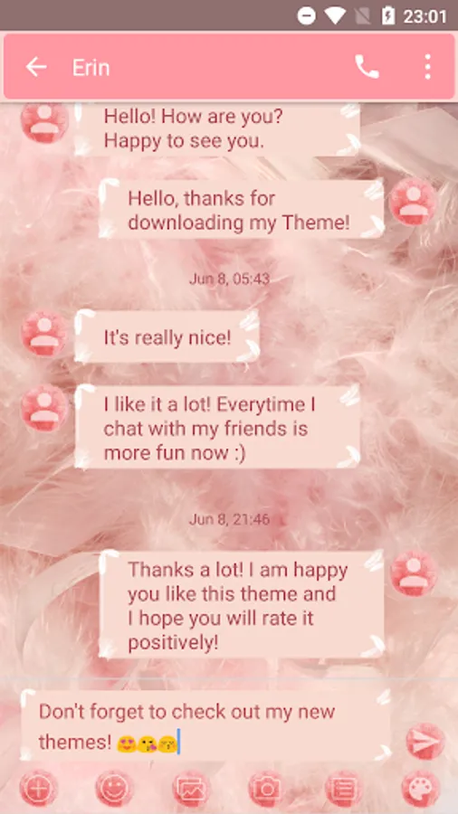 This is a theme with pink message box decorated by white feathers over a fluffy pink feathers background for SMS+MMS Messages application: please install SMS Messages main program to use this theme.