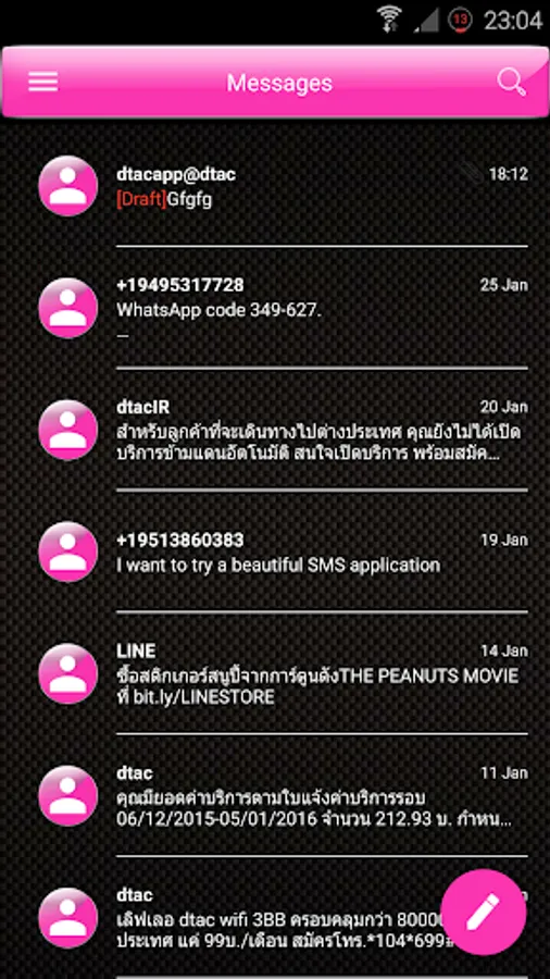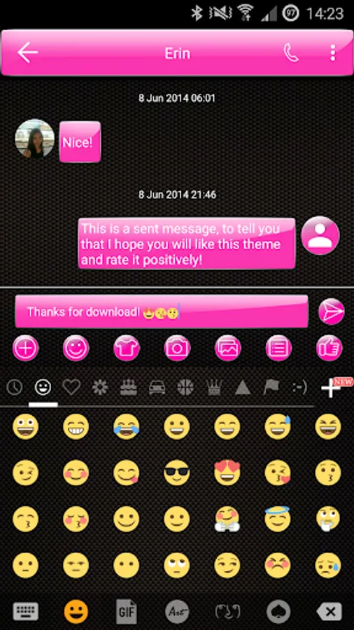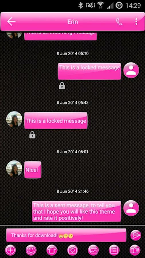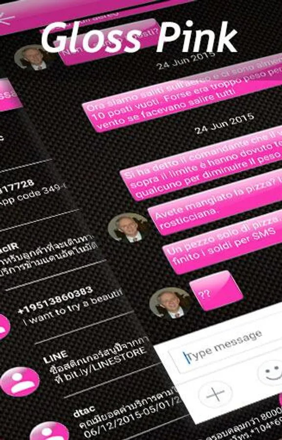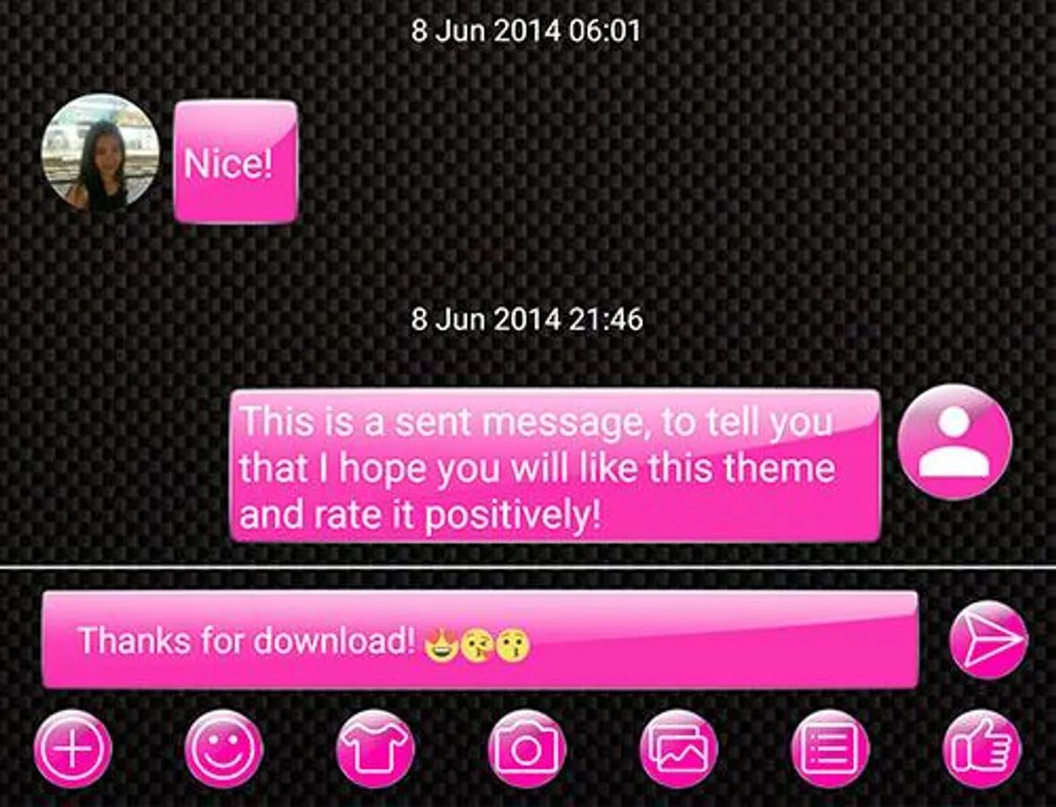 This is a theme with pink high gloss message box over a dark spot background for SMS Messages application: please install SMS Messages main program to use this theme.