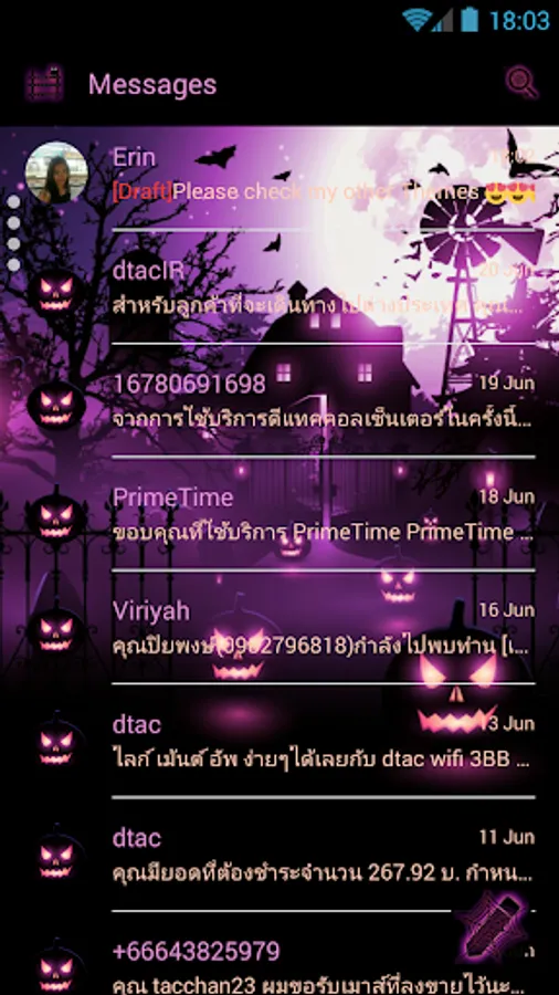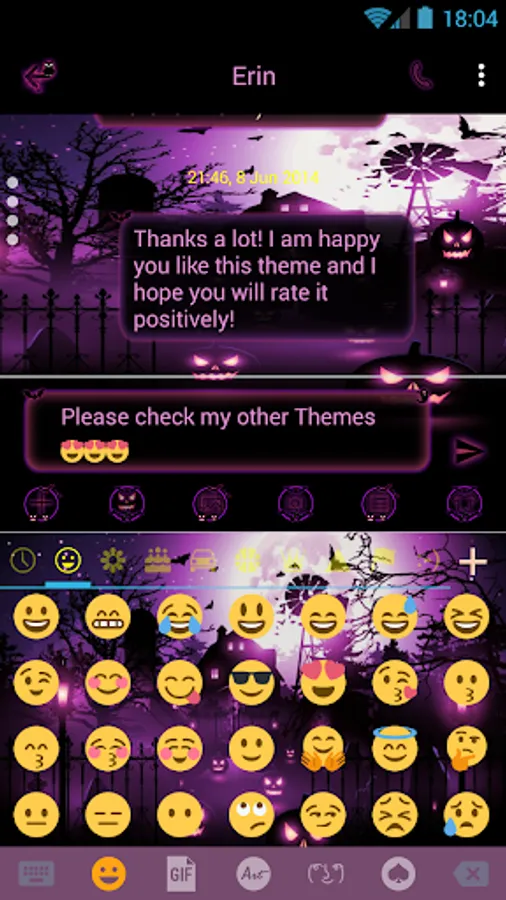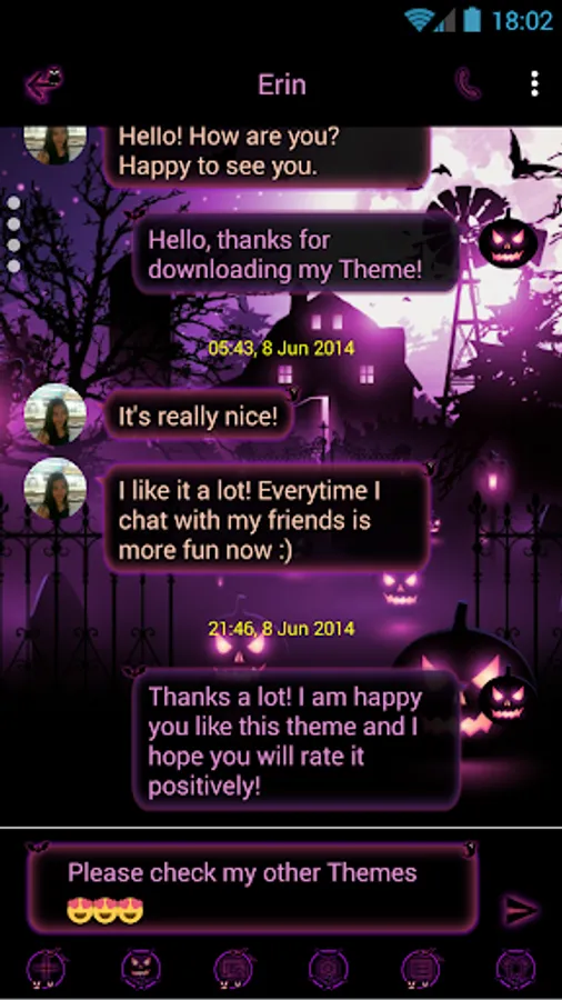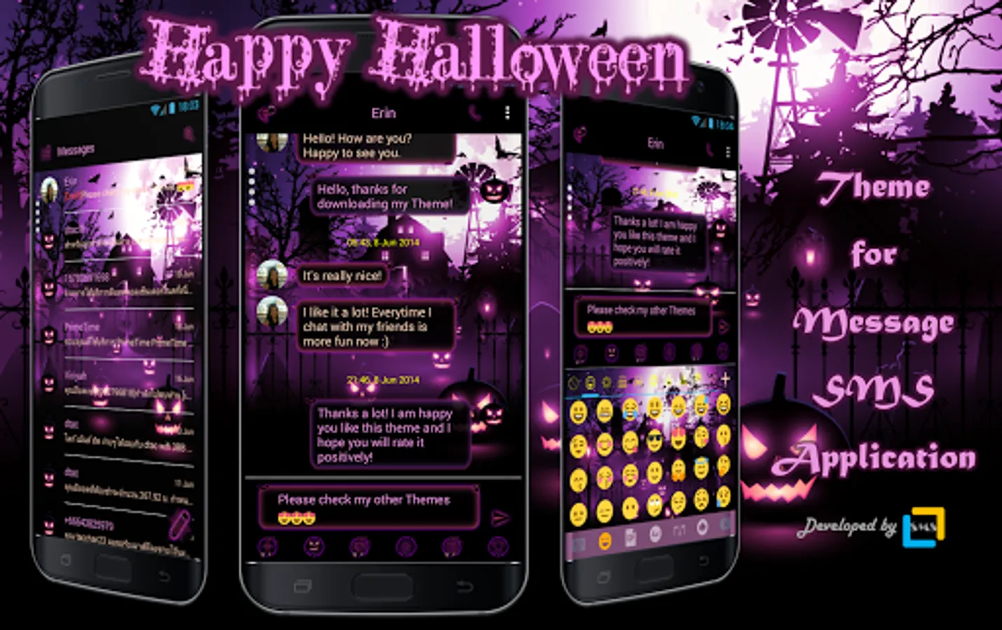 This is a pink and purple dark theme to celebrate a Happy Halloween night with cute pumpkins and ghosts and witches over a wallpaper background with a bewitching full moon for SMS Messenger application: please install SMS Messages main program to use this theme.
