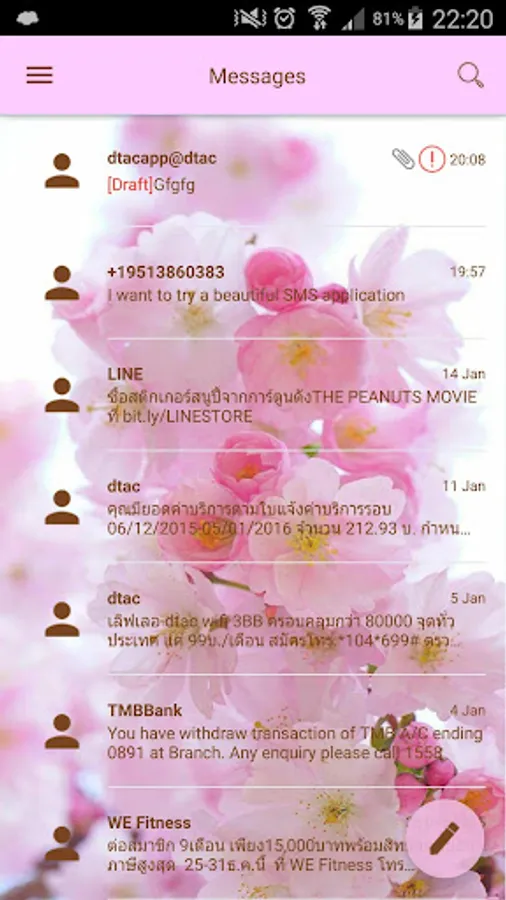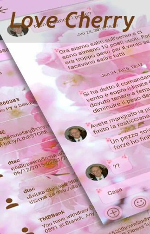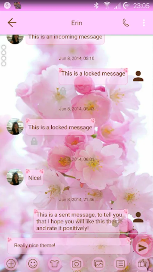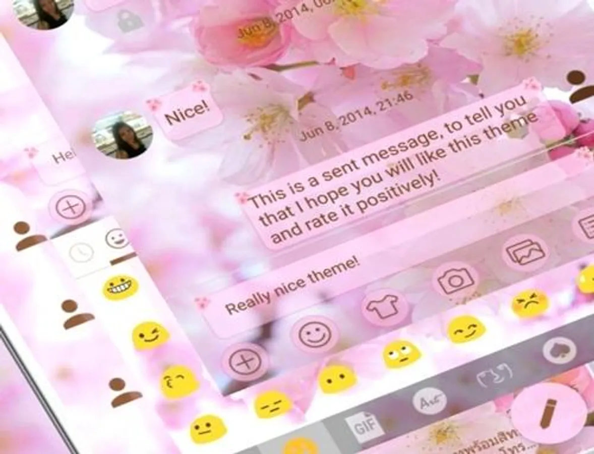This is a theme with soft pink keys over a cherry blossom background for SMS Messages application: please install SMS Messages main program to use this theme.