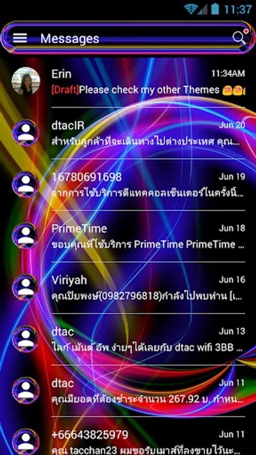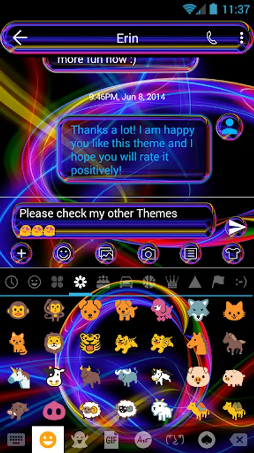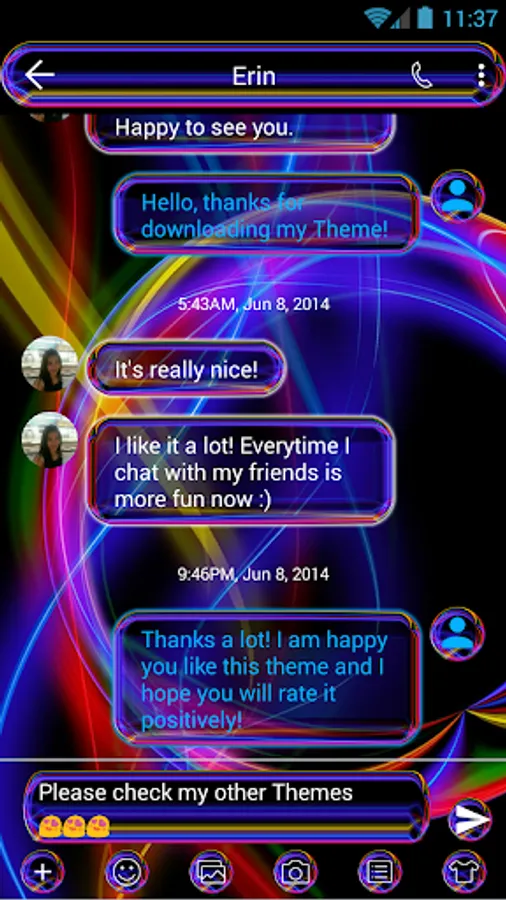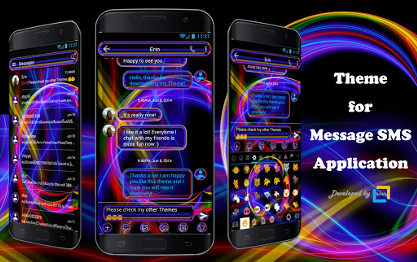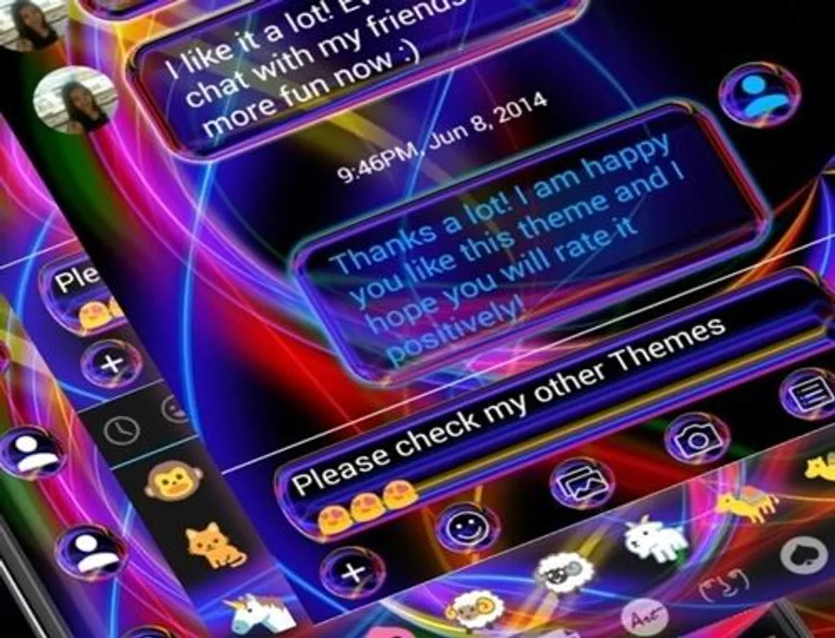 This is a theme with neon multicolored message box over an abstract swirling neon lights background for SMS+MMS Messages application: please install SMS Messages main program to use this theme.