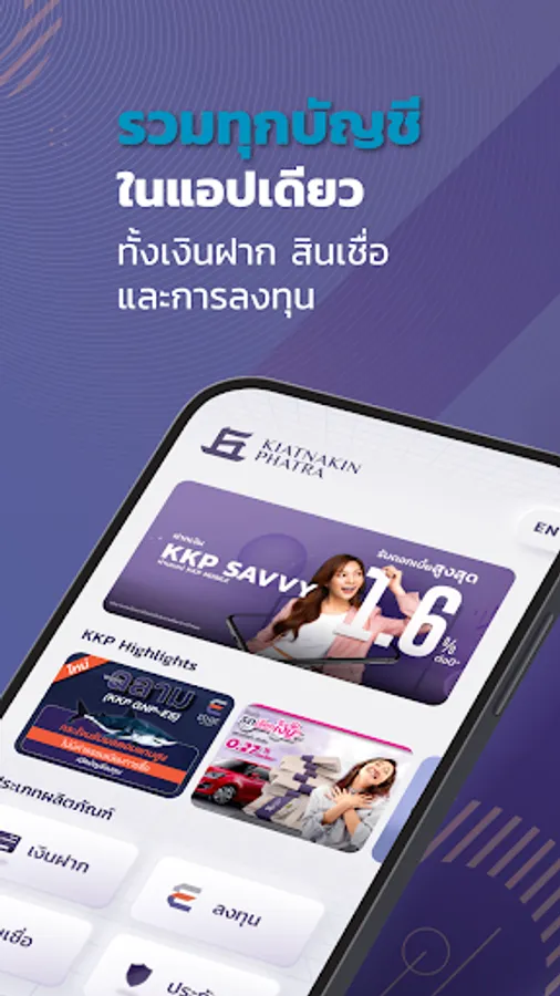 KKP MOBILE, an application from Kiatnakin Phatra Financial Group includes savings & fixed deposit, investments, many types of loans, cash card, debit card and insurance. You can open an account by yourself with the highest security system.