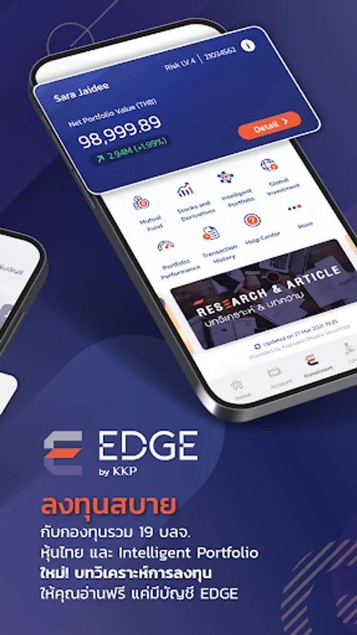 Invest with EDGE: Enhance your investment experience, covering Thai stocks, foreign stocks, bonds, mutual funds, and more than 50 exchange traded funds around the world. Providing timely investment advice in every situation.