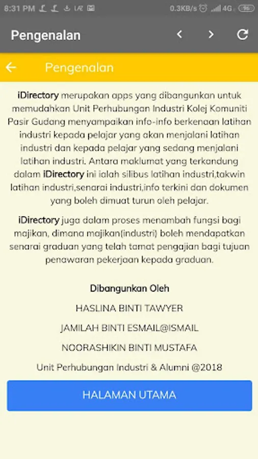 iDirectory merupakan aplikasi mobile yang dibangunakn untuk memudahkan Unit Perhubungan Industri & Alumni, KKPG menyampaikan segala makluman yang berkaitan dengan latihan industri iaitu Silibus, Takwim, Senarai Industri, Info Terkini serta pelajar boleh memuat turun dokumen yang berkaitan.