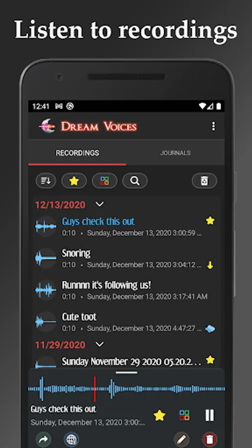 Wondering if you sleep talk? Want to prove to your partner that they snore? Trying to capture that weird unexplained noise in the middle of the night? Welcome Dream Voices - Sleep Recorder. The ultimate multi-function sleep talk recorder app with dream journaling and relaxing sleep sounds.