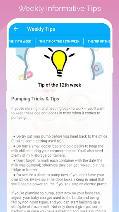 - Weekly Development: You can learn the week by week development of your newborn baby and learn more about the tricks of baby care with the weekly tips.