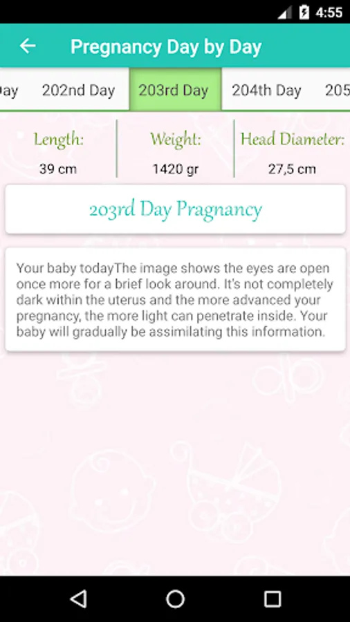 ● Your day to day pregnancy details. It provides information about the development of your baby, changes in your body, diet and exercises for 280 days.