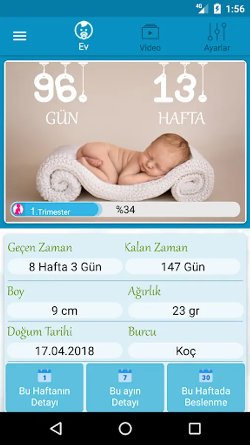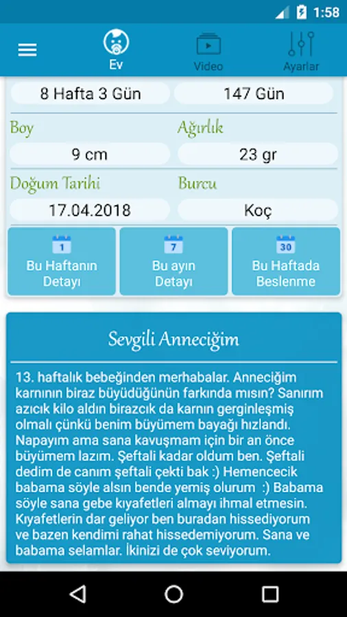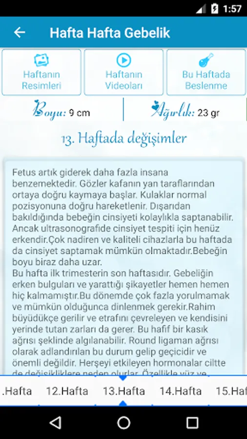 - Detailed information for each week. You will have detailed information about your or your baby's development.
